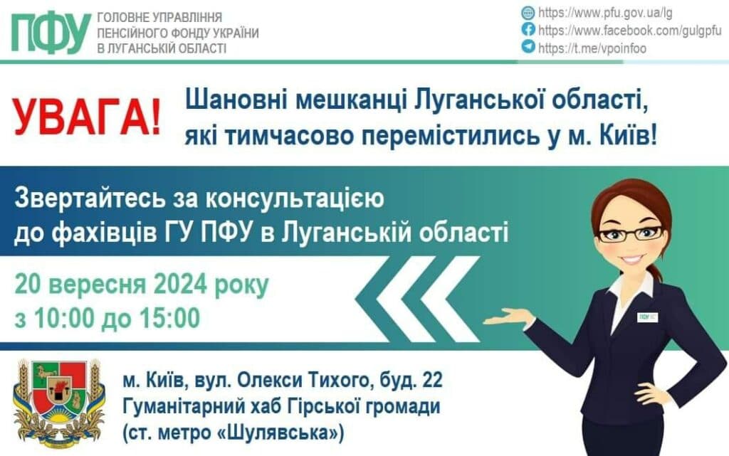 "20 вересня в Києві відбудеться прийом переселенців представником ГУ ПФУ в Луганській області. Звернутися за вирішенням пенсійних питань можна з 10:00 до 15:00 до хабу Гірської громади", — йдеться у повідомленні.