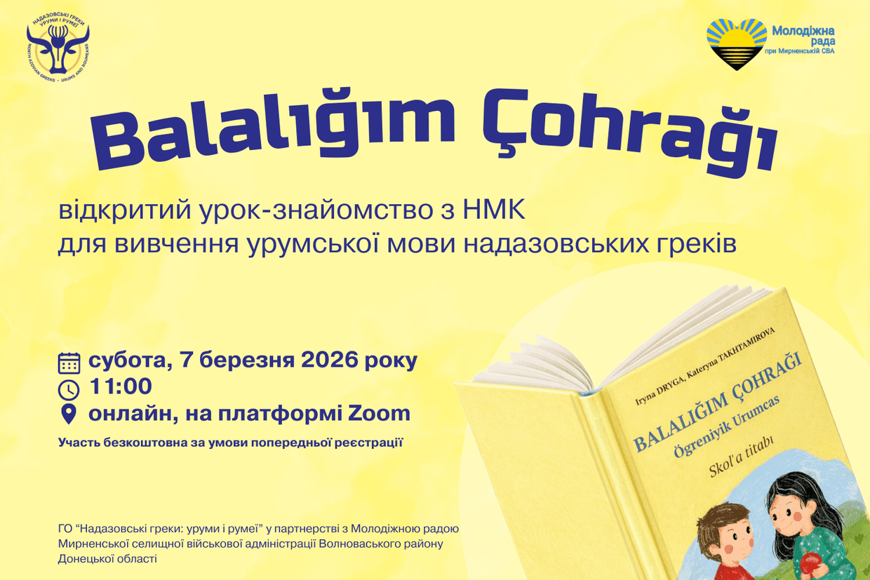 У суботу, 7 березня, відбудеться відкритий онлайн-урок Balalığım Çohrağı (урум. Джерело мого дитинства), під час якого учасників познайомлять із навчально-методичним комплексом для вивчення урумської мови надазовських греків.