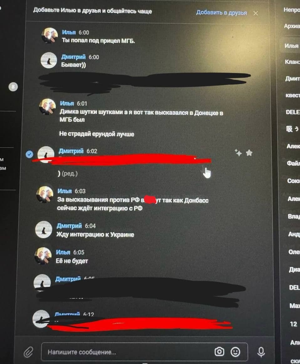 «У 2021 році я виклав пост у соцмережах зі стелою Донецької області й з українським прапором. І вже після цього один знайомий написав мені, що за мною слідкують і я знаходжуся на прицілі «мвд днр». Мене попередили, що краще так не говорити, і цей знайомий сказав, що вони чекають приєднання до росії. Я відповів на це, що я чекаю на інтеграцію з Україною, у мене український паспорт, і я не мають відношення до їхніх поглядів».