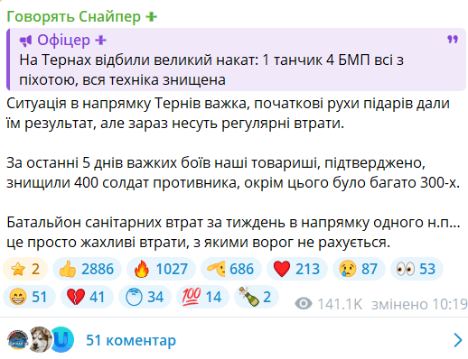 Ситуація в напрямку Тернів важка, початкові рухи окупантів дали їм результат, але зараз — несуть регулярні і значні втрати.