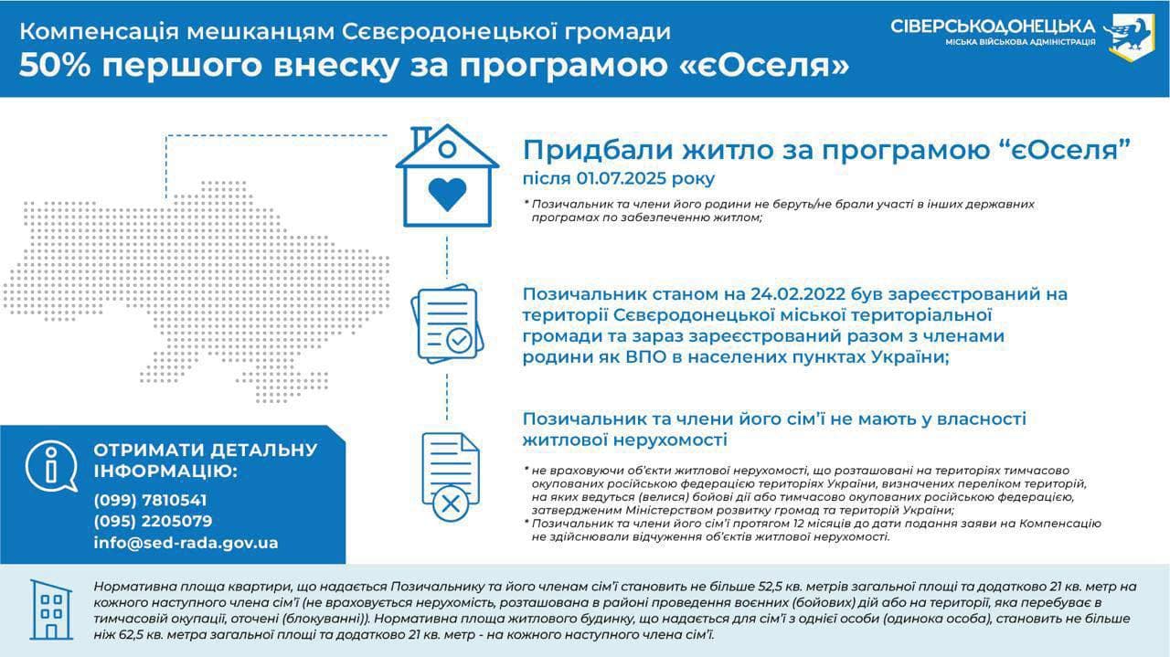 Програма передбачає часткову компенсацію першого внеску у межах 250 тис. грн за іпотечним кредитом на придбання житла у будь-якому регіоні України, що відповідає умовам програми "єОселя".