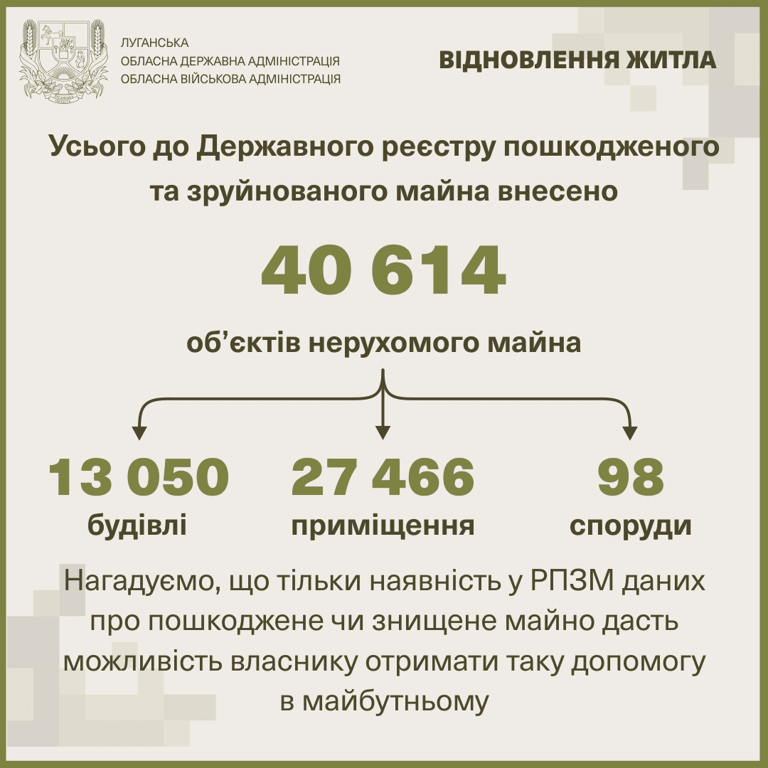Загалом до Реєстру пошкодженого та знищеного майна внесено 40 614 об’єктів нерухомого майна, у тому числі 13 050 будівель, 27 466 приміщень та 98 споруд.