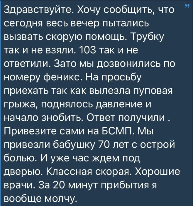 У одному з місцевих телеграм-каналів маріупольчанка написала пост з обуренням стосовно роботи "швидкої допомоги".