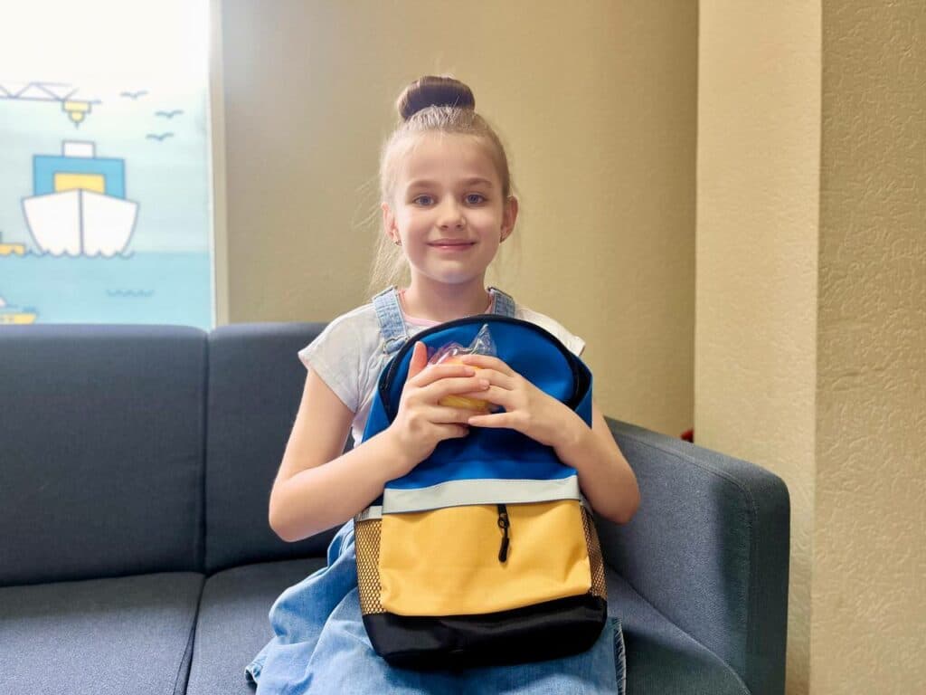 "Всередині так багато всього цікавого! Зошити, олівці, блокноти, навіть є іграшка антистрес. А ще мені дуже подобається рюкзак, бо він кольору нашого прапору".