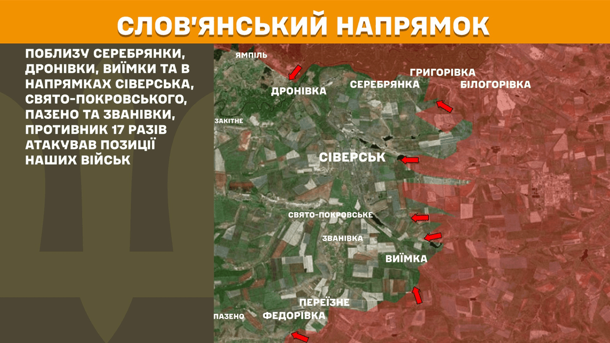 На Слов’янському напрямку поблизу Серебрянки, Дронівки, Виїмки та в напрямках Сіверська, Свято-Покровського, Пазено та Званівки, противник 17 разів атакував позиції наших військ.