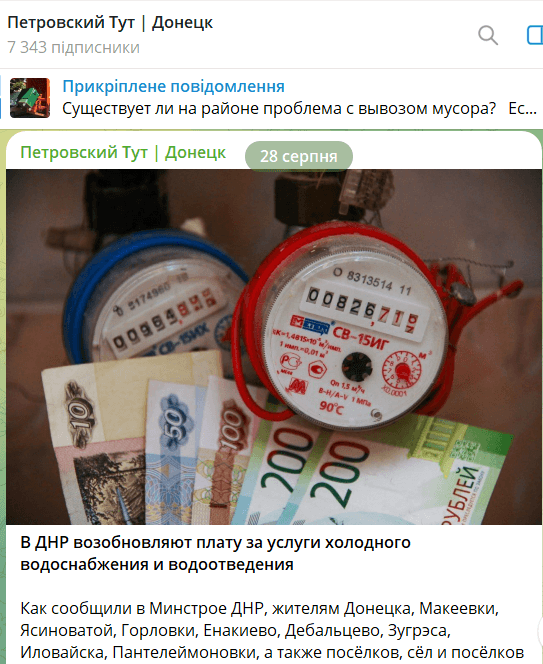 Як повідомили у невизнаному "мінбуді днр", жителям Донецька, Макіївки, Ясинуватої, Горлівки, Єнакієвого, Дебальцевого, Зугресу, Іловайська, Пантелеймонівки, а також селищ, сіл і селищ даних міських округів виставлять рахунки за послуги холодного водопостачання та водовідведення з 7 серпня 2024 року.
