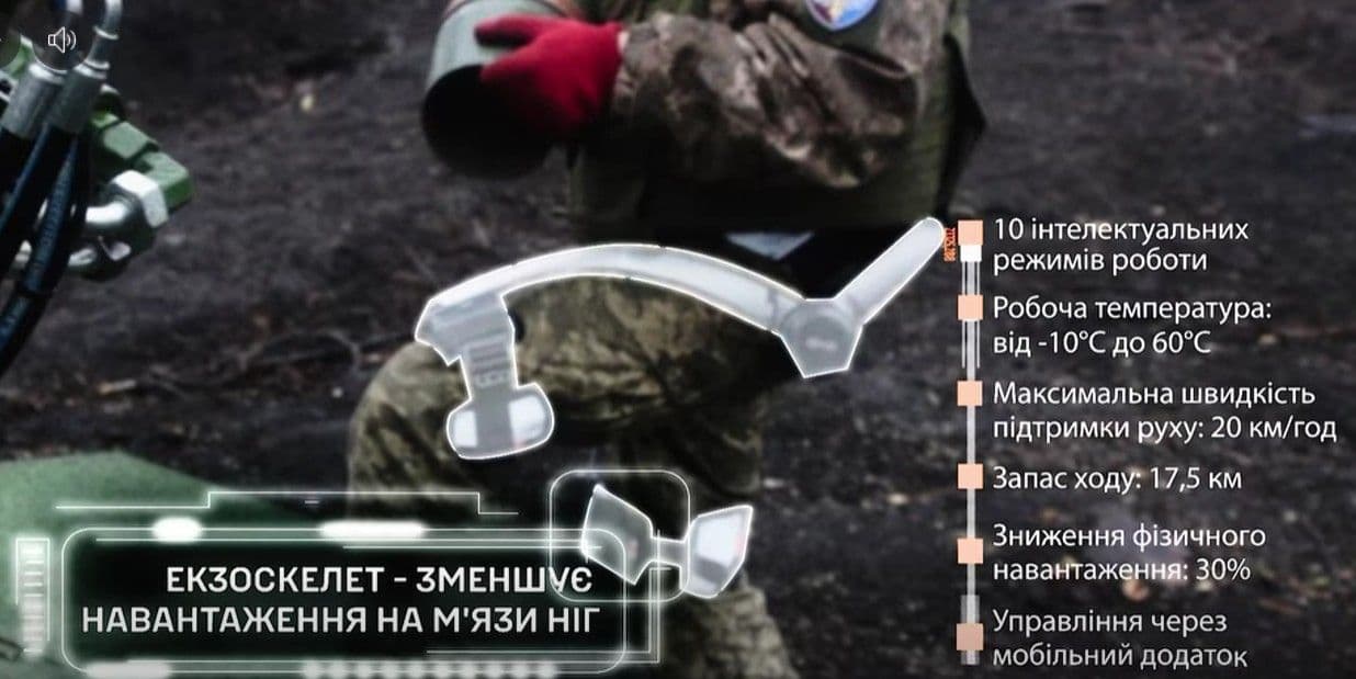 Зазначається, що екзоскелет допомагає знизити фізичне навантаження на бійця до 30%. Максимальна швидкість підтримки 20 км/год, а запас ходу — 17,5 км.