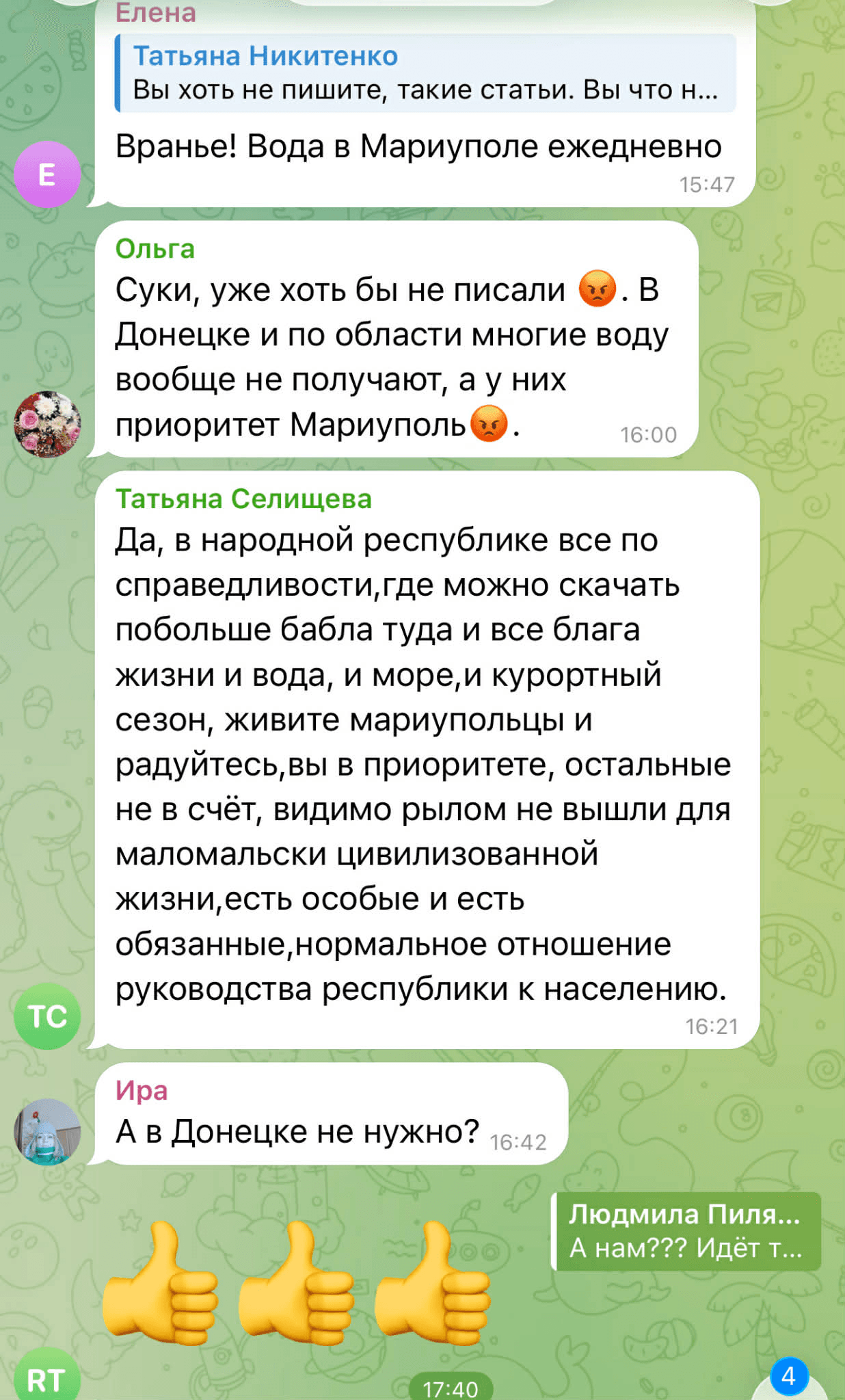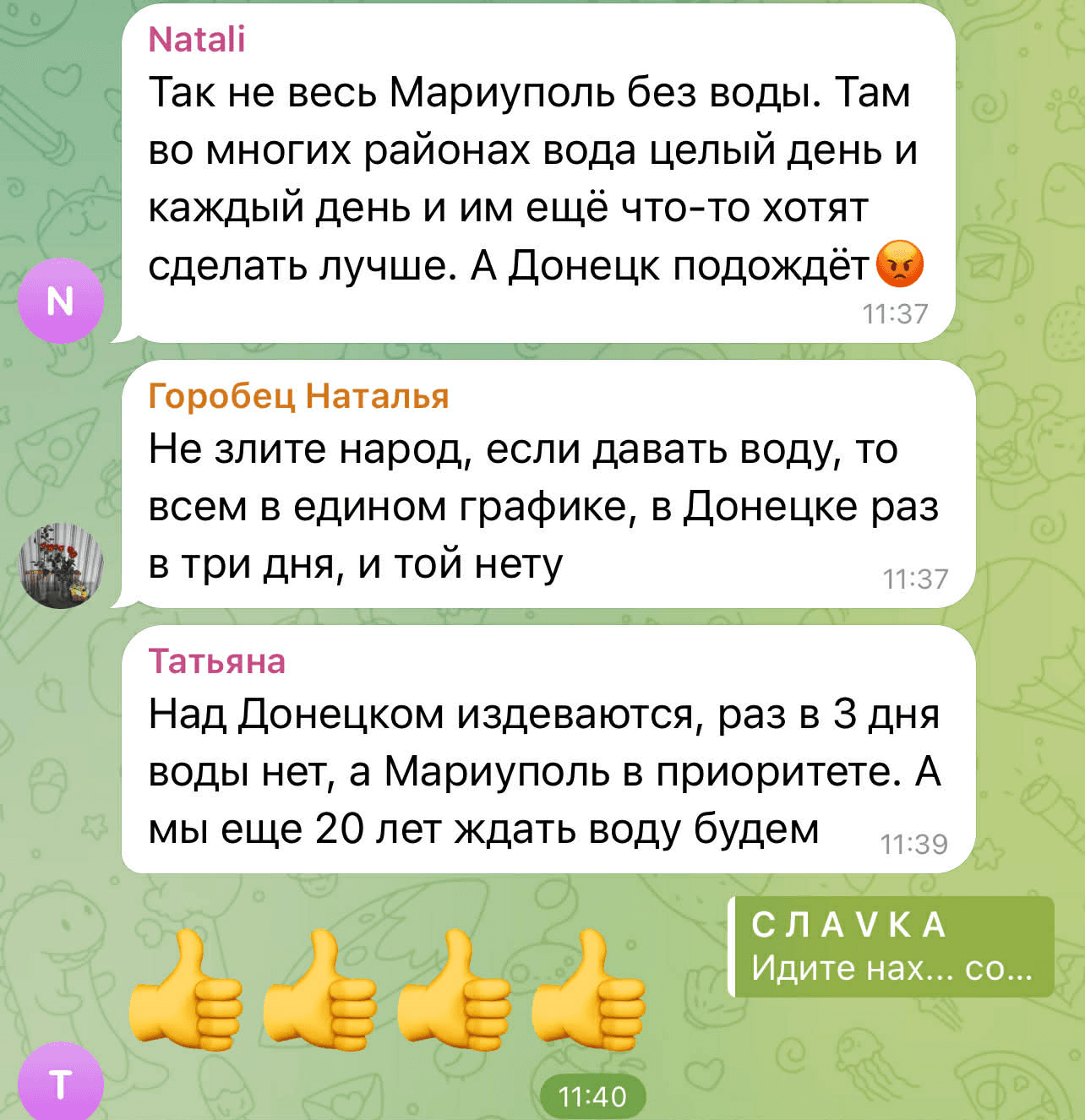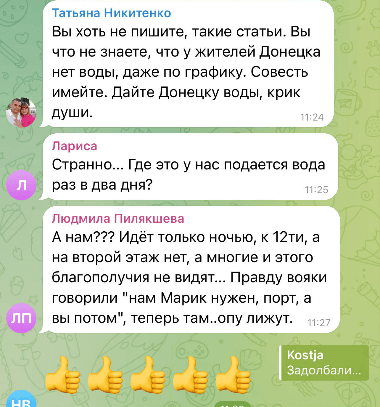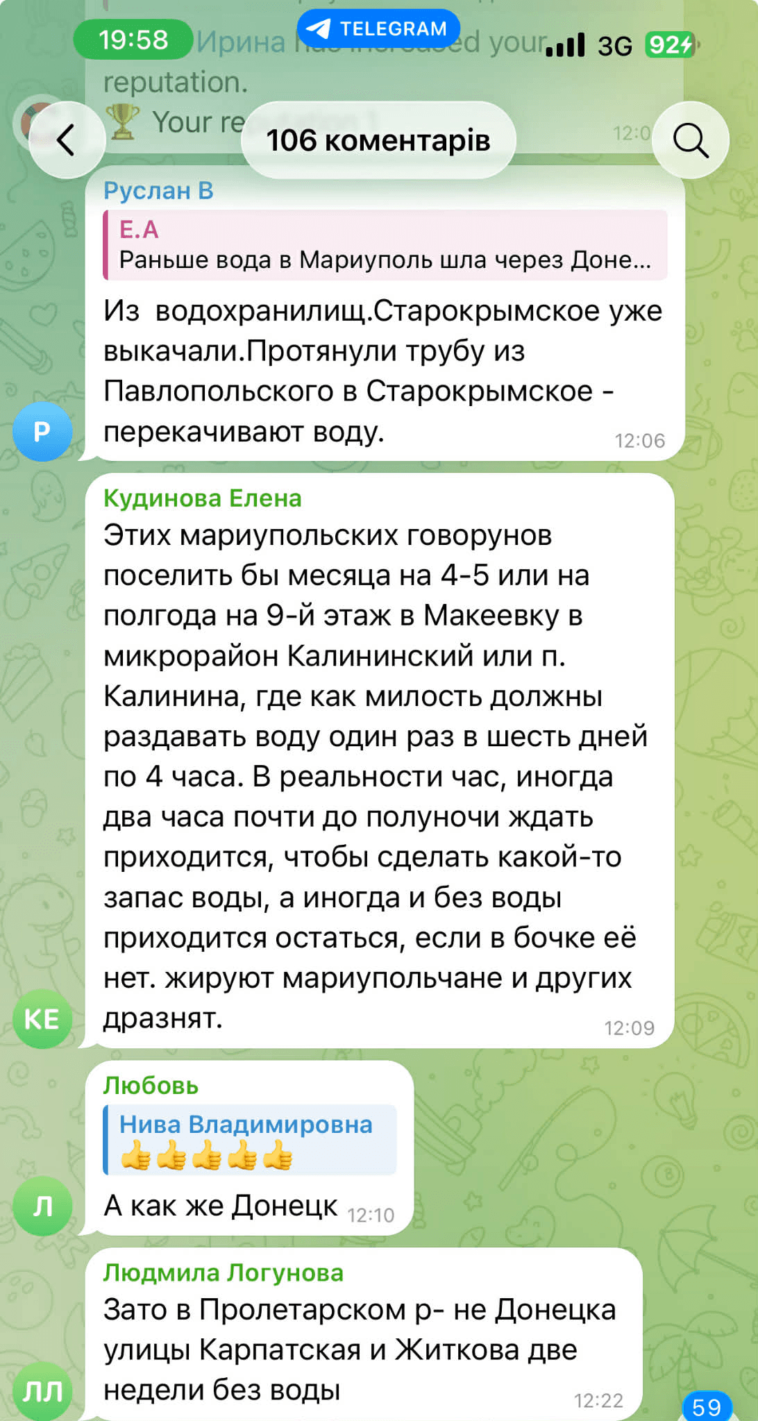У коментарях у Telegram ця новина викликала негативну реакцію. Люди почали сперечатися між собою, де на ТОТ проблема з водопостачанням є більш глобальною, і скаржилися на відсутність води в окупованих районах Донецька та в Макіївці.