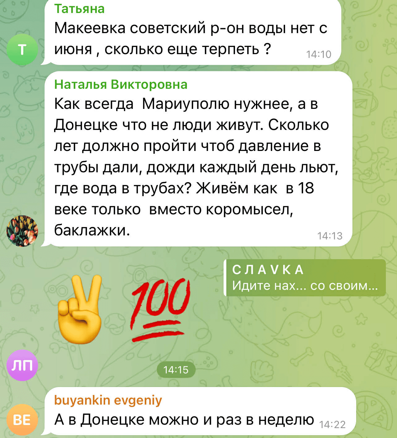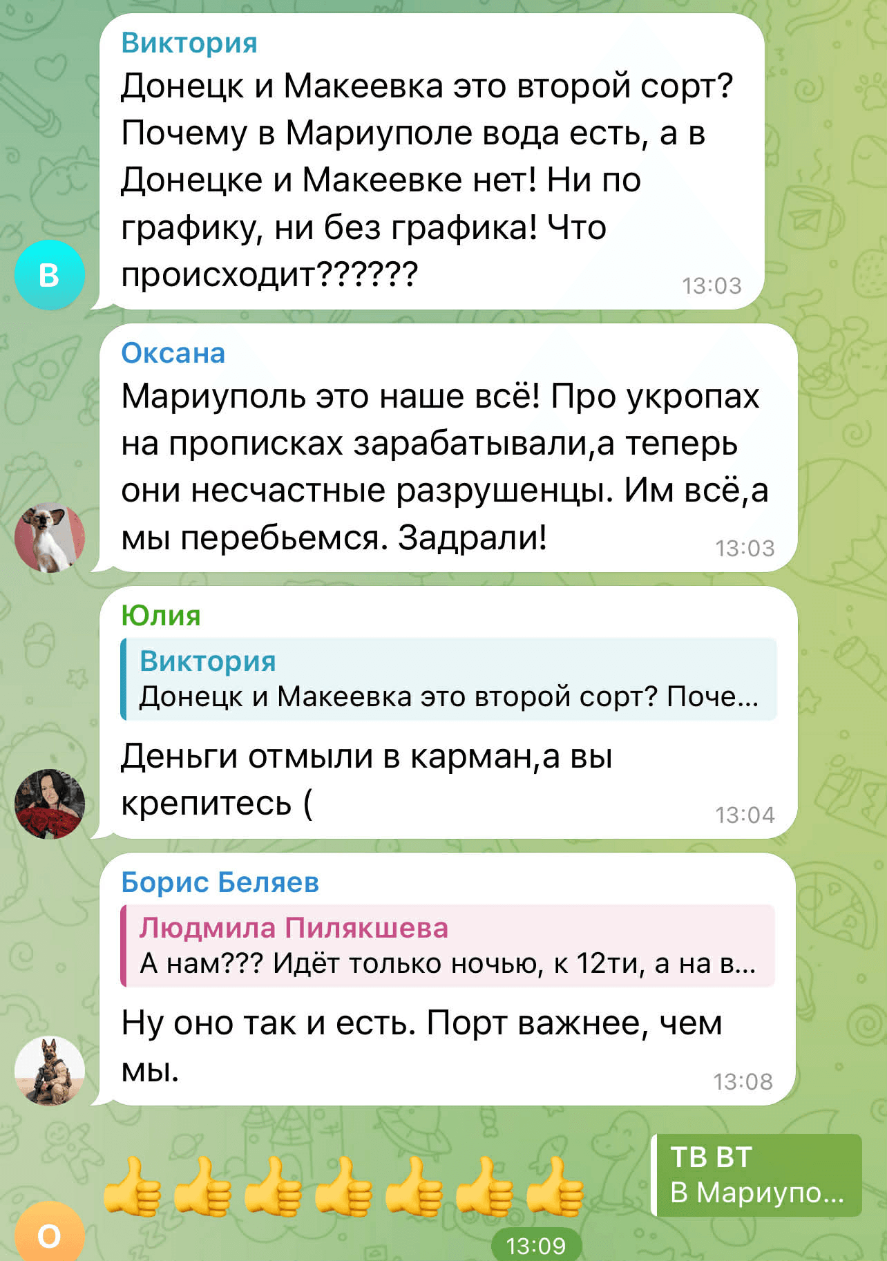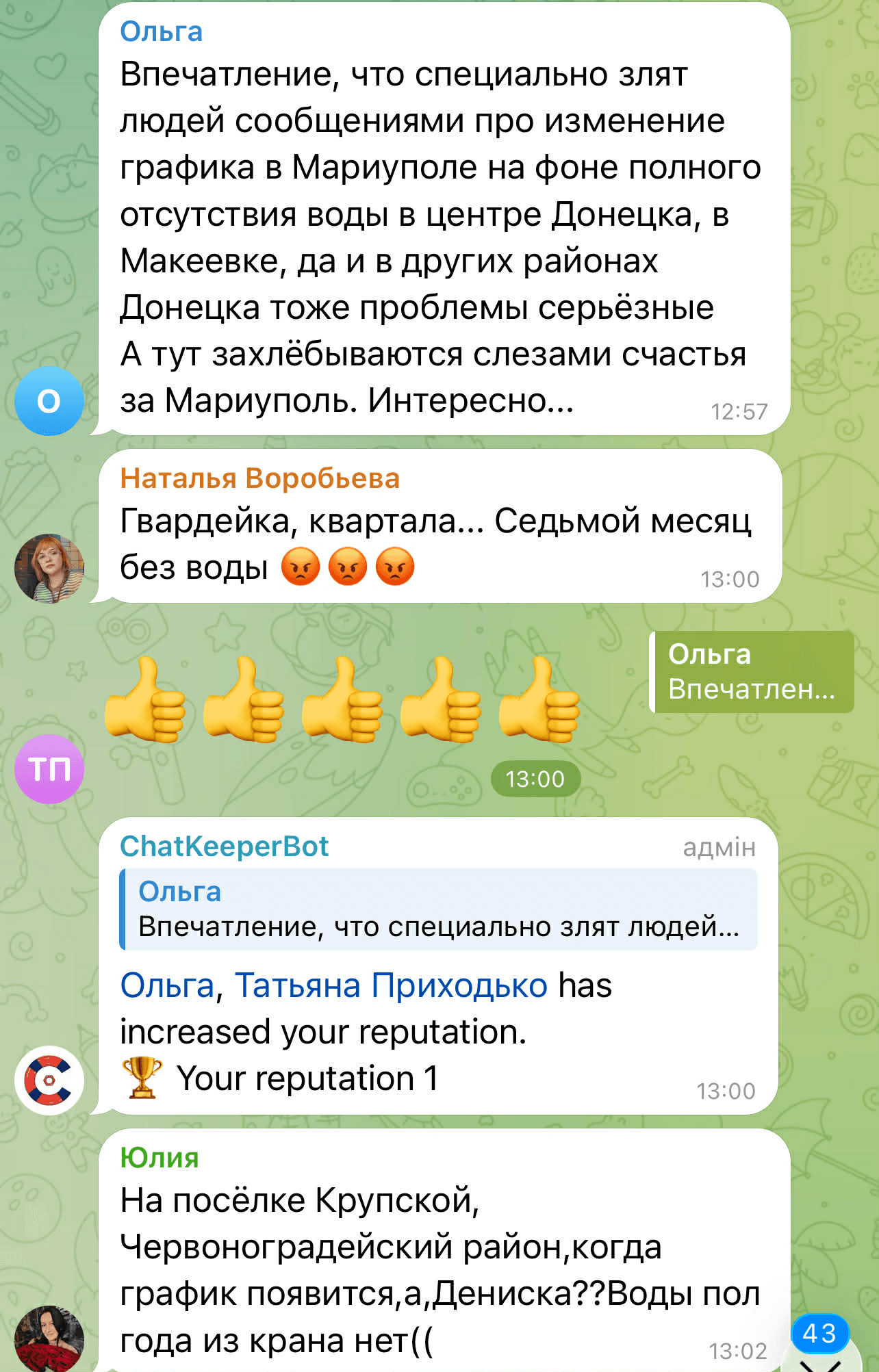 У коментарях у Telegram ця новина викликала негативну реакцію. Люди почали сперечатися між собою, де на ТОТ проблема з водопостачанням є більш глобальною, і скаржилися на відсутність води в окупованих районах Донецька та в Макіївці.