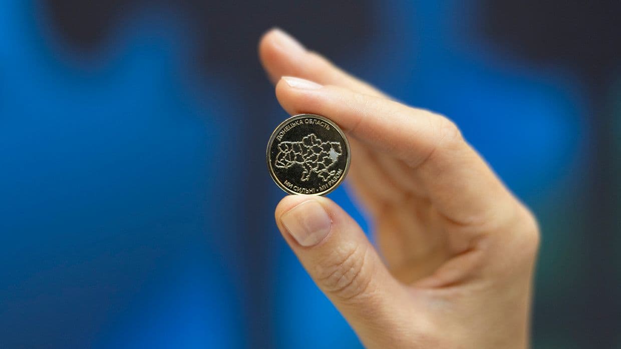 - на монеті “Ми сильні. Ми разом. Донецька область” виокремлено Донецьку область;