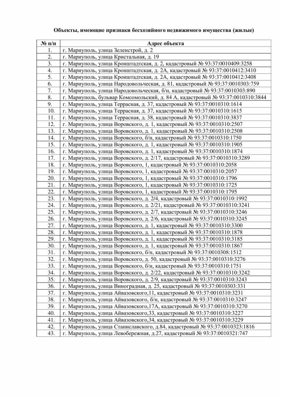 "Окупаційна адміністрація розмістила новий список так званих "житлових приміщень з ознаками безгосподарних". У ньому налічується понад 100 адрес маріупольців: квартири, будинки, житлові приміщення", — повідомили в міськраді.