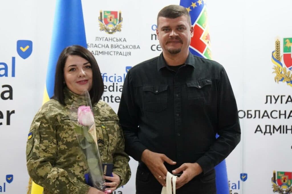 Так, Сергію Сокирці — вчителю математики Чмирівського ліцею, а нині військовослужбовцю 121-го окремого полку зв'язку, та Світлані Наумовій – педагогу-організатору Гірського ліцею, військовослужбовиці 108-ї бригади ТрО, начальник Луганської ОДА Артем Лисогор вручив знаки пошани "Захиснику Луганщини".