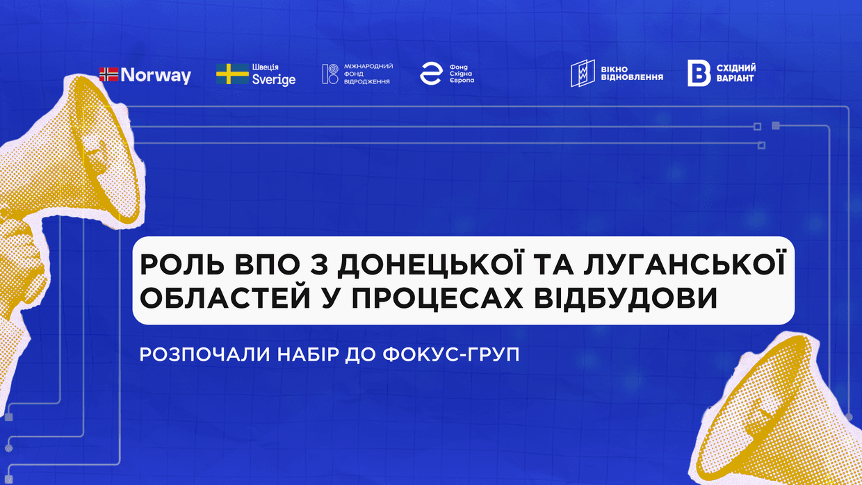 У межах проєкту "Відбудова Сходу: діалог заради майбутнього" відбудуться фокус-групові обговорення за участі внутрішньо переміщених осіб з Донецької та Луганської областей. Вони проходитимуть онлайн і триватимуть близько 1,5 години.