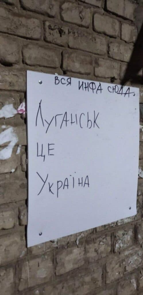 "На доске объявлений активист движения “Жовта Стрічка“ написал важнейшую информацию, которую должны помнить в Украине и мире. А другая активистка напомнила, что наши люди в Луганске есть и ждут возвращения Украины", — говорится в сообщении.
