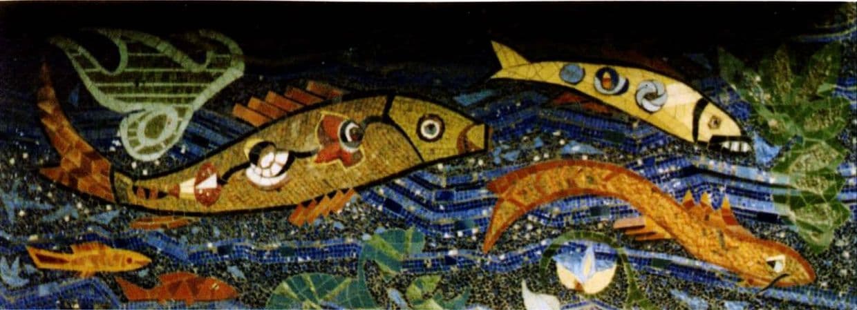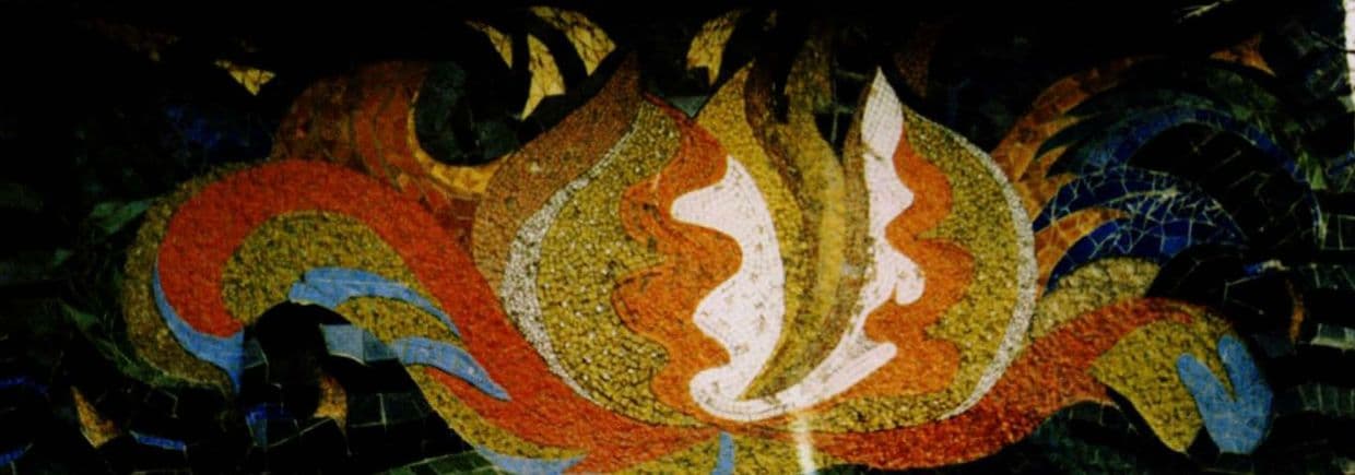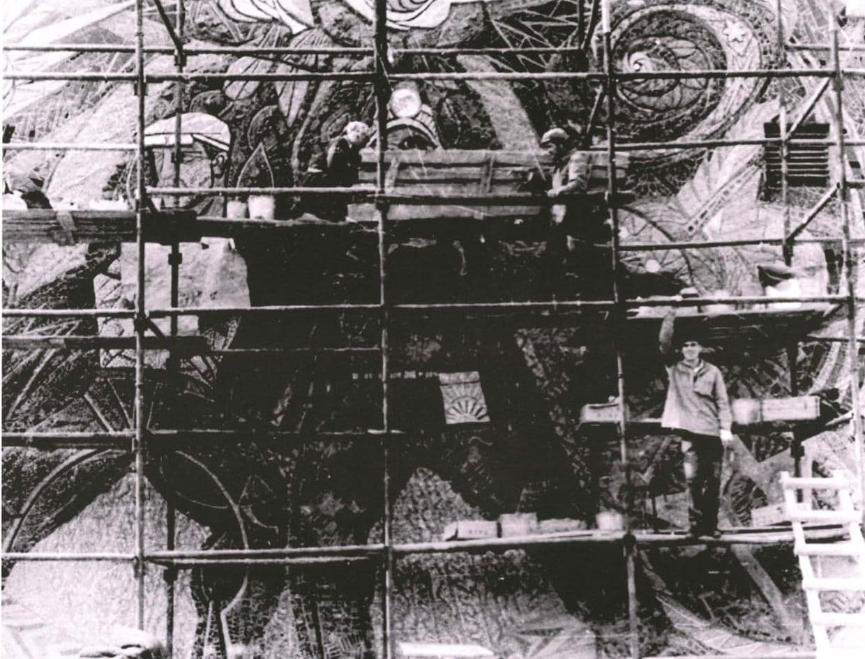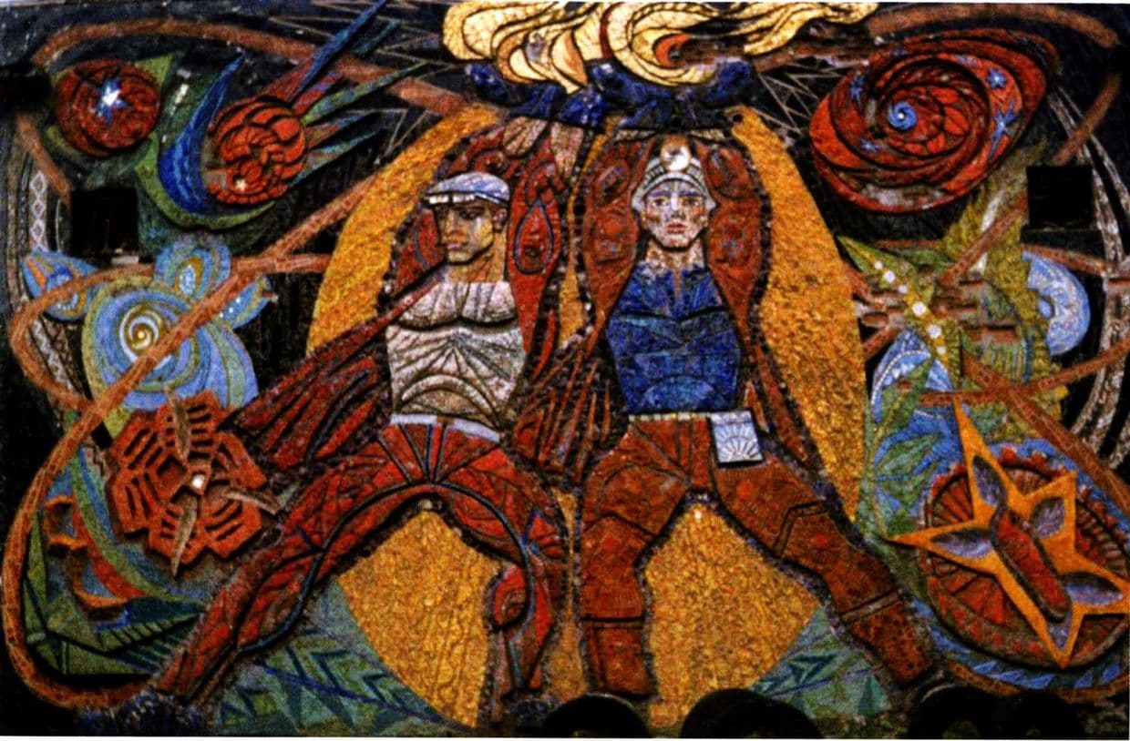 В конце концов работа над школой была завершена, как и ее центральная мозаика. Соисполнитель Геннадий Марченко позже так описывал панно “Прометеи”: