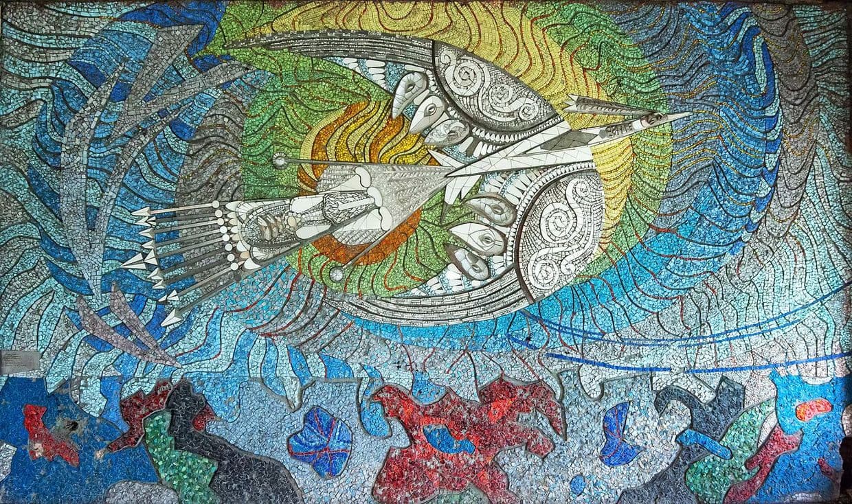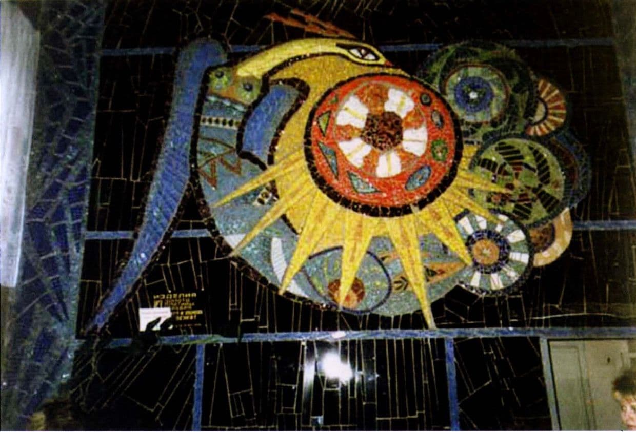 “Эти мозаики выполнены в стиле колористики. Если посмотреть на каждую из них, то они имеют чисто украинские традиционные символы цветовым наполнением, цветовое наполнение. Было много синего и желтого цветов. Мотивы связаны именно с украинским фольклором и традиционной культурой. Мы помним, что это были годы прославления полета Гагарина и покорителей Космоса. Но если посмотреть на панно «Космос», то что мы видим? Две птицы, одна синего, другая — желтого цвета, которые летят навстречу друг другу”, — рассказывает Ирина Пятницкова.