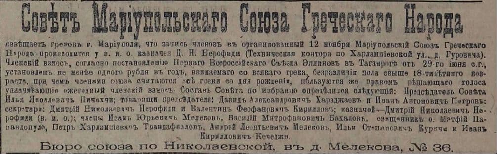 “10 ноября 1917 года в Мариуполе был создан Совет Мариупольского союза греческого народа, в состав которого вошли известные представители румейской и урумской громад — члены еще дореволюционных греческих организаций: Мариупольского благотворительного товарищества и Товарищества мариупольских греков — выходцев из Крыма. Главой совета избрали Илью Пичахчи”, — рассказывает Анатолий Медведев.