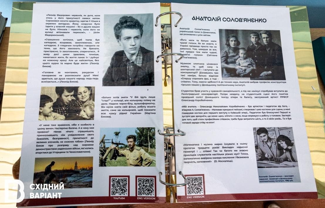 На выставке представлено специальное издание о выдающихся личностях Донетчины. Здесь можно прочитать об актере Леониде Быкове, поэте Василии Стусе, писателе Олексе Тихом, певце Анатолии Соловьяненко и других.
