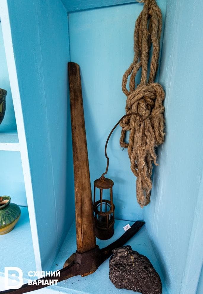Рядом размещено рабочее снаряжение шахтера — кирка, веревка, фонарь и кусок добытого угля.