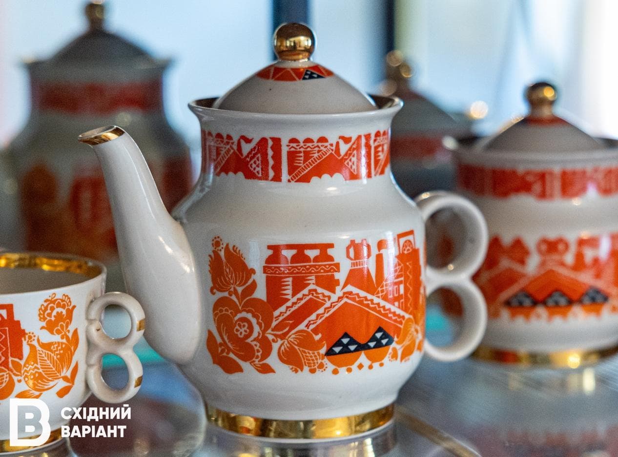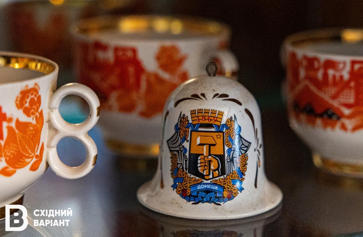 В гостиной внимание привлекает необычный сервиз в шкафу. Его рисунок передает не что иное, как донецкие терриконы, шахтерские стволы и заводские трубы, из которых идет дым.