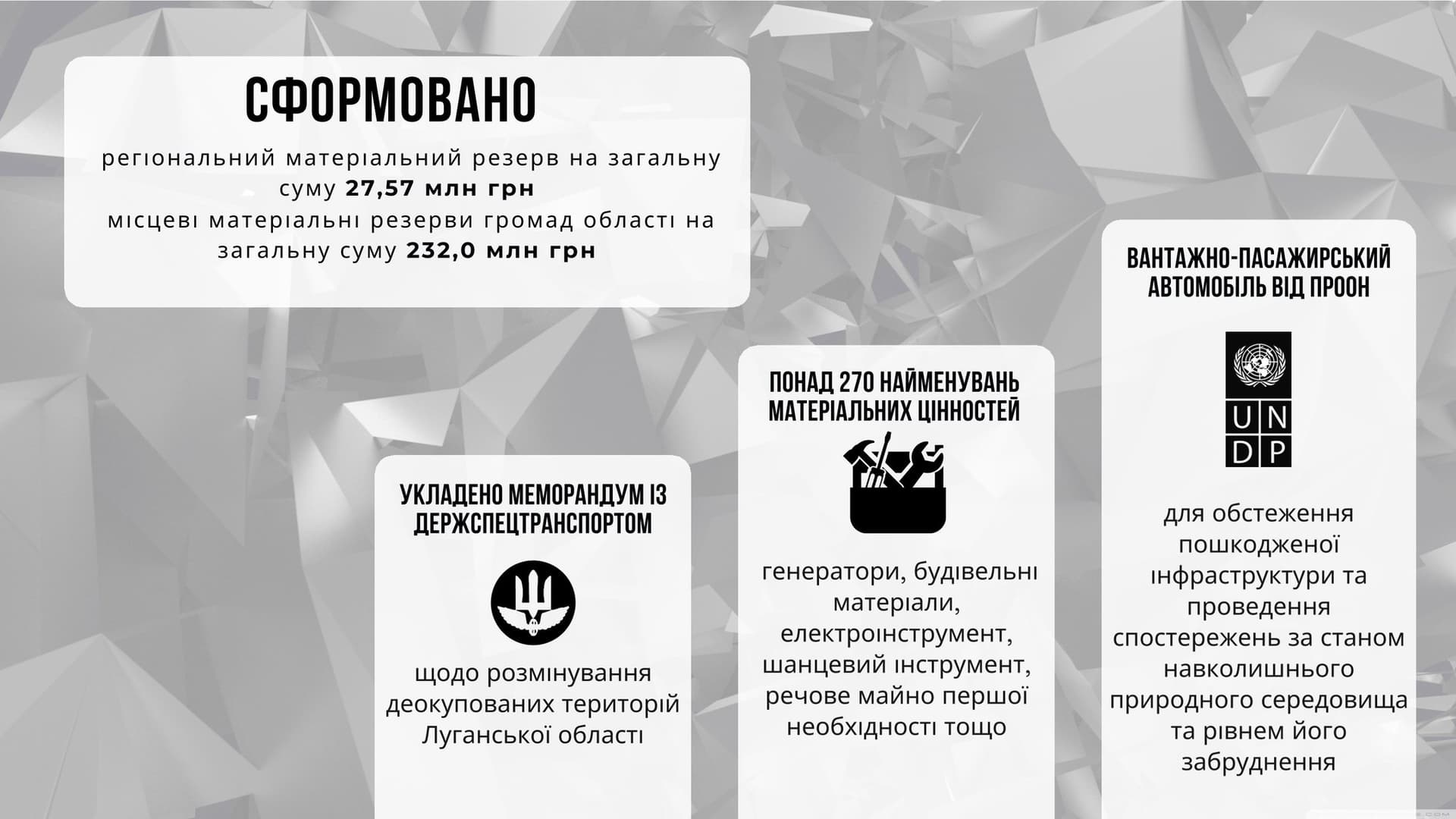 В частности, это — подготовка к деоккупации территорий и восстановление власти после освобождения Луганщины. Прежде всего, формирование регионального материального резерва. Он составляет почти 27,6 млн грн, и матрезервов громад области, составляют 232,0 млн грн, а также помощь ВСУ, на что из областного бюджета потрачено более 458,0 млн грн.