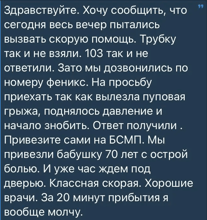 В одном из местных телеграм-каналов мариупольчанка написала пост с возмущением по поводу работы "скорой помощи".