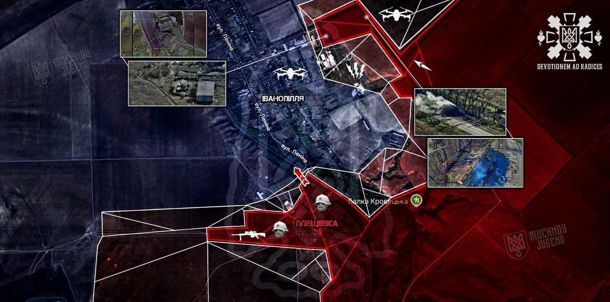 "Судя по данным, уже смог занять Плещеевку. Полностью н.п. еще не стабилизировано, однако большая часть находится в красной зоне, там продолжается постоянный контакт и работа дронов с обеих сторон. Далее противник развивает наступление в направлении Иванополья, делая ставку на продвижение через посадки и фермерские хозяйства. Им удалось зацепиться за один из участков к юго-востоку от села, но наши бойцы сразу отработали по вражескому ЗИЛу и БТР-Д — обе цели ликвидированы точными попаданиями FPVшек", — пояснил военный.