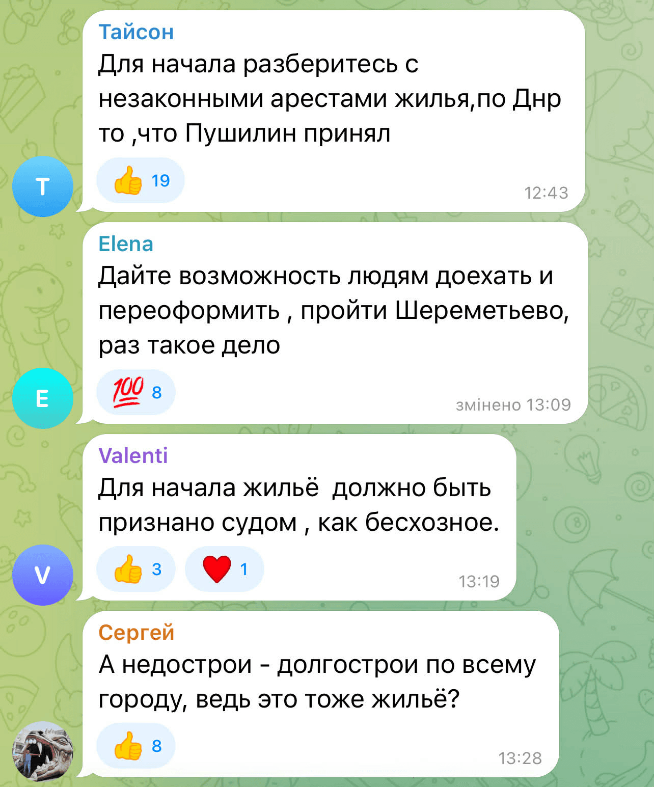 Оккупанты пишут, это означает что «если квартира или дом стоят пустыми и у них нет хозяев, их будут оформлять на регион или город». Но добавляют, что «это сделано якобы для того, чтобы жилье не простаивало и могло приносить пользу людям».