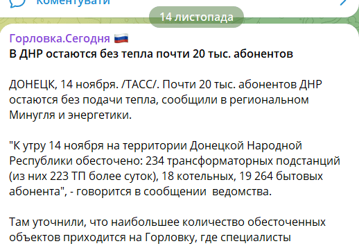 «На утро 14 ноября на территории «днр» обесточены: 234 трансформаторные подстанции (из них 223 ТП более суток), 18 котельных, 19 264 бытовых абонента», — говорится в сообщении.