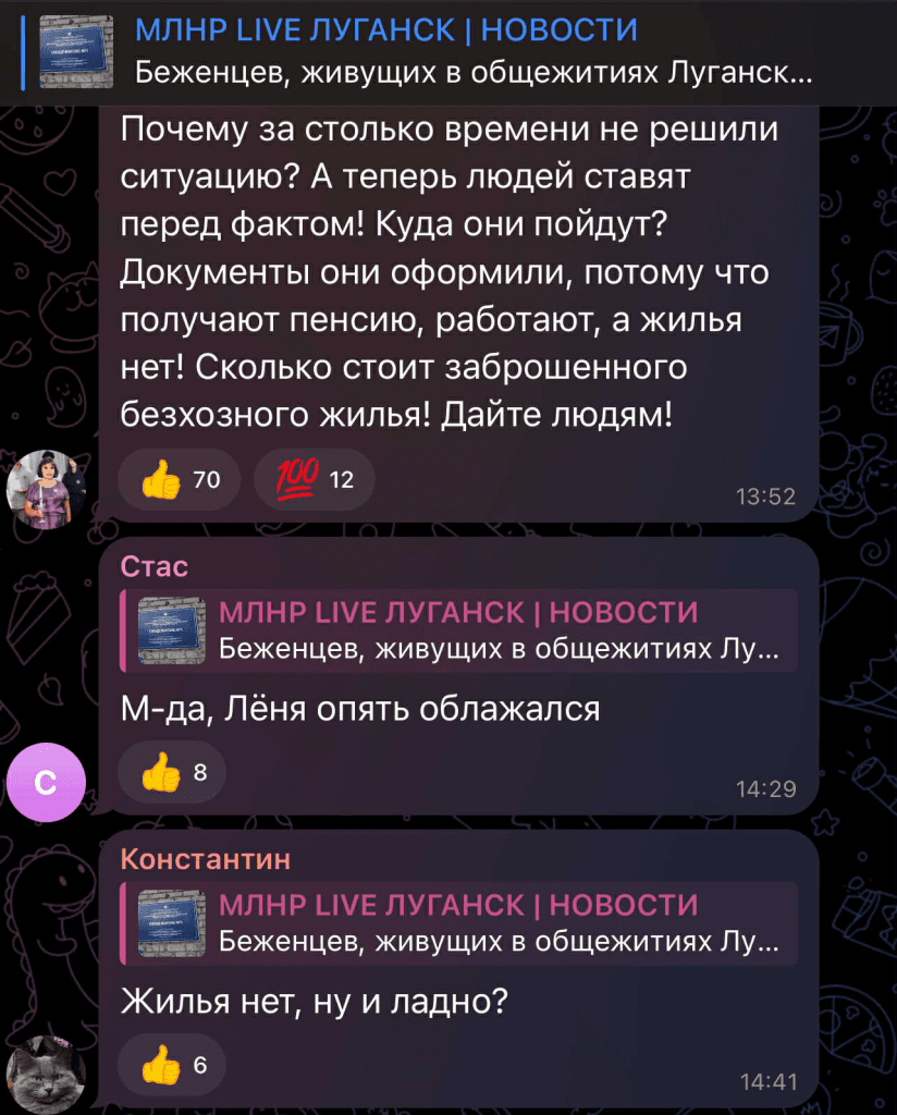 В оккупации выселяют людей из Луганщины и из общежитий, которые заселяли еще с 2014-го, есть люди пенсионного возраста, которые жалуется, что не могут себе позволить даже аренду, не говоря уже о приобретении собственного жилья. Кроме того захватчики, в той же Попасной не признают, что жилье граждан, которые фактически оказались на улице - является разрушенным.