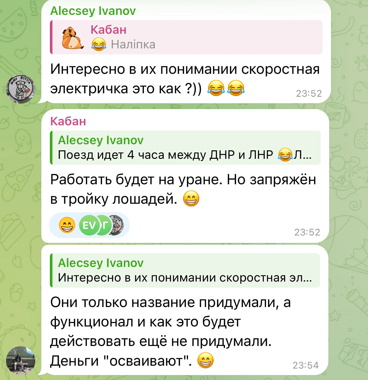 "Следующим этапом работы "пригородной пассажирской железнодорожной компании" станет организация пассажирских перевозок из "лнр". Уже работаем над организацией скоростного железнодорожного сообщения с "соседней республикой". Ведем работу по организации прямого железнодорожного пригородного сообщения между Иловайском и Ростовом-на-Дону. В дальнейшей перспективе — выйти на Запорожскую и Херсонскую области", — заявил оккупант Бондаренко.