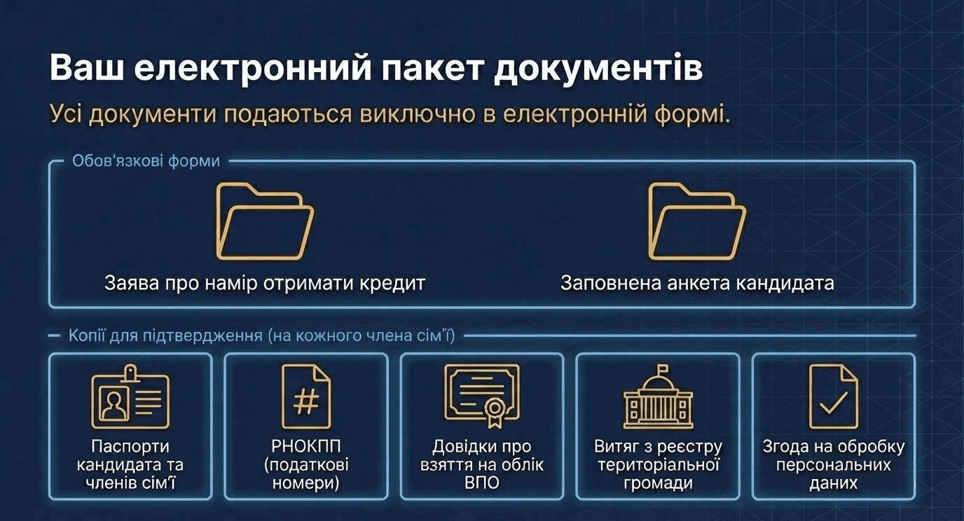 Заявление о намерении получить кредит и анкета подаются в электронной форме путем направления документов на электронную почту Управления жилищно-коммунального хозяйства и инфраструктуры Кременской городской военной администрации: 📧 zkh@kremrada.gov.ua