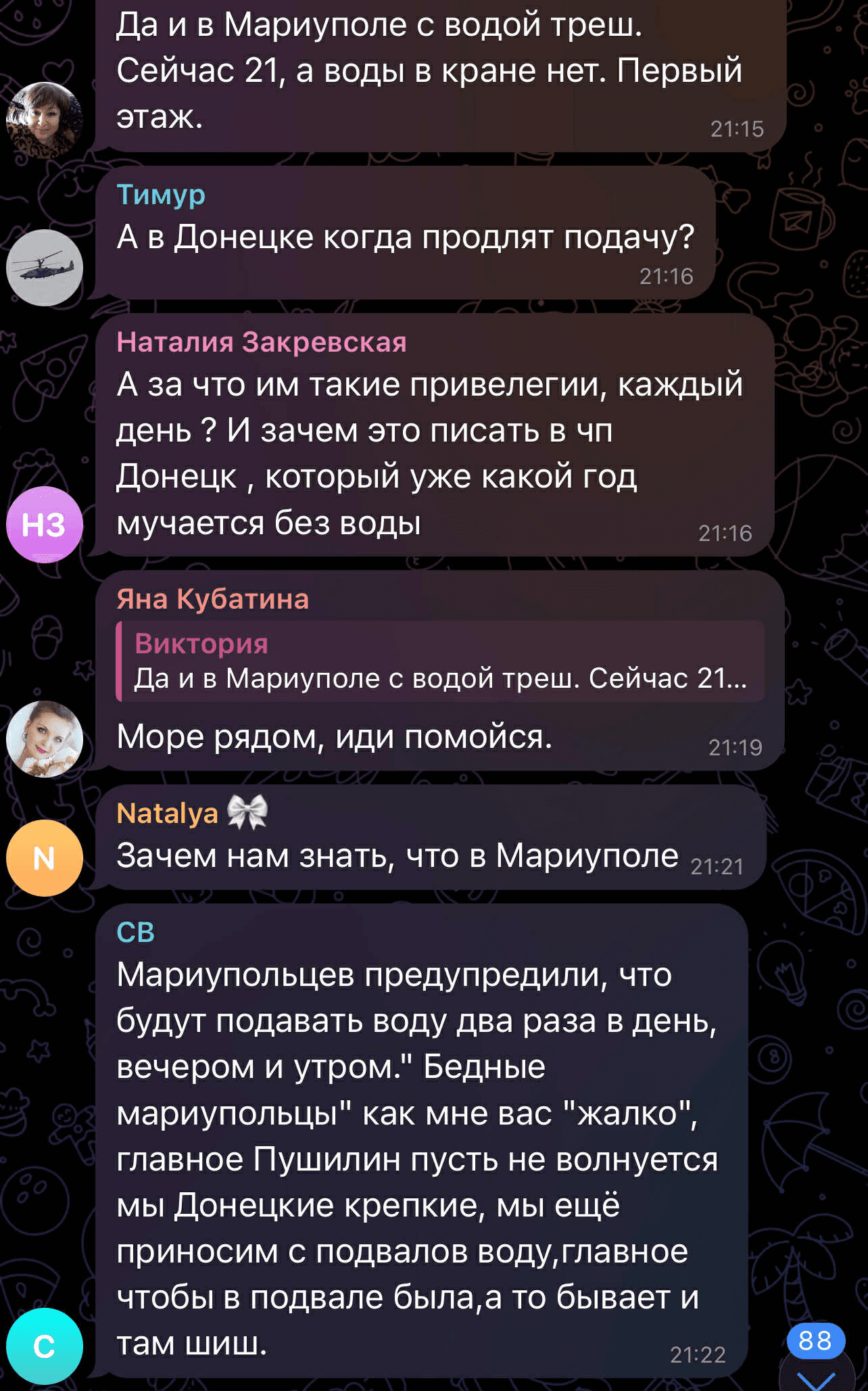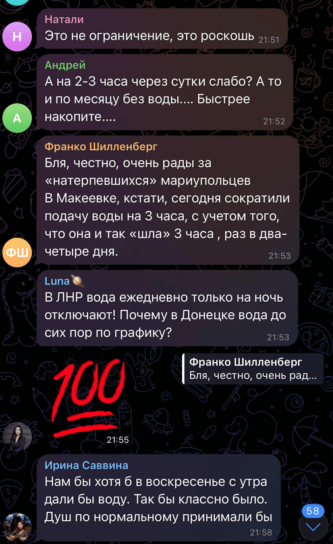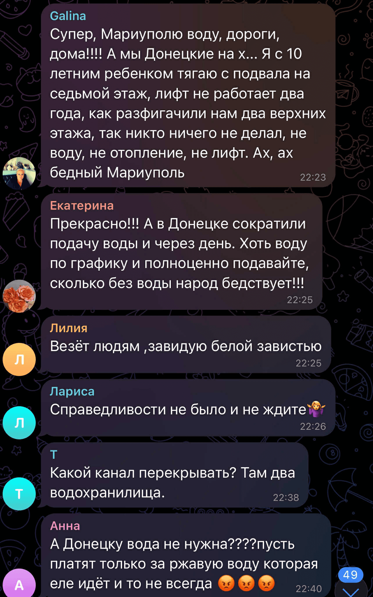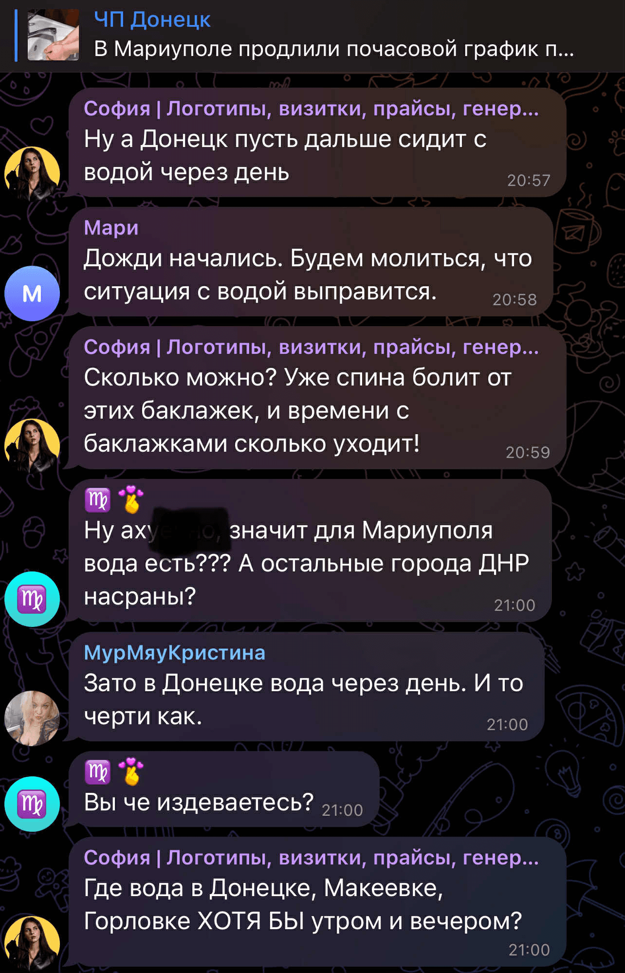 После того, как эту новость опубликовали в одном из Телеграм-ресурсов, пишущем о жизни оккупантов в оккупированном Донецке, в комментариях возникло возмущение и дискуссия, оказалось, что в оккупированном Донецке завидуют такому графику подачи воды с ограничениями, который действует в оккупированном Мариуполе. Люди в оккупации и дальше жалуются, что им приходится пристраиваться жить без стабильного водоснабжения.