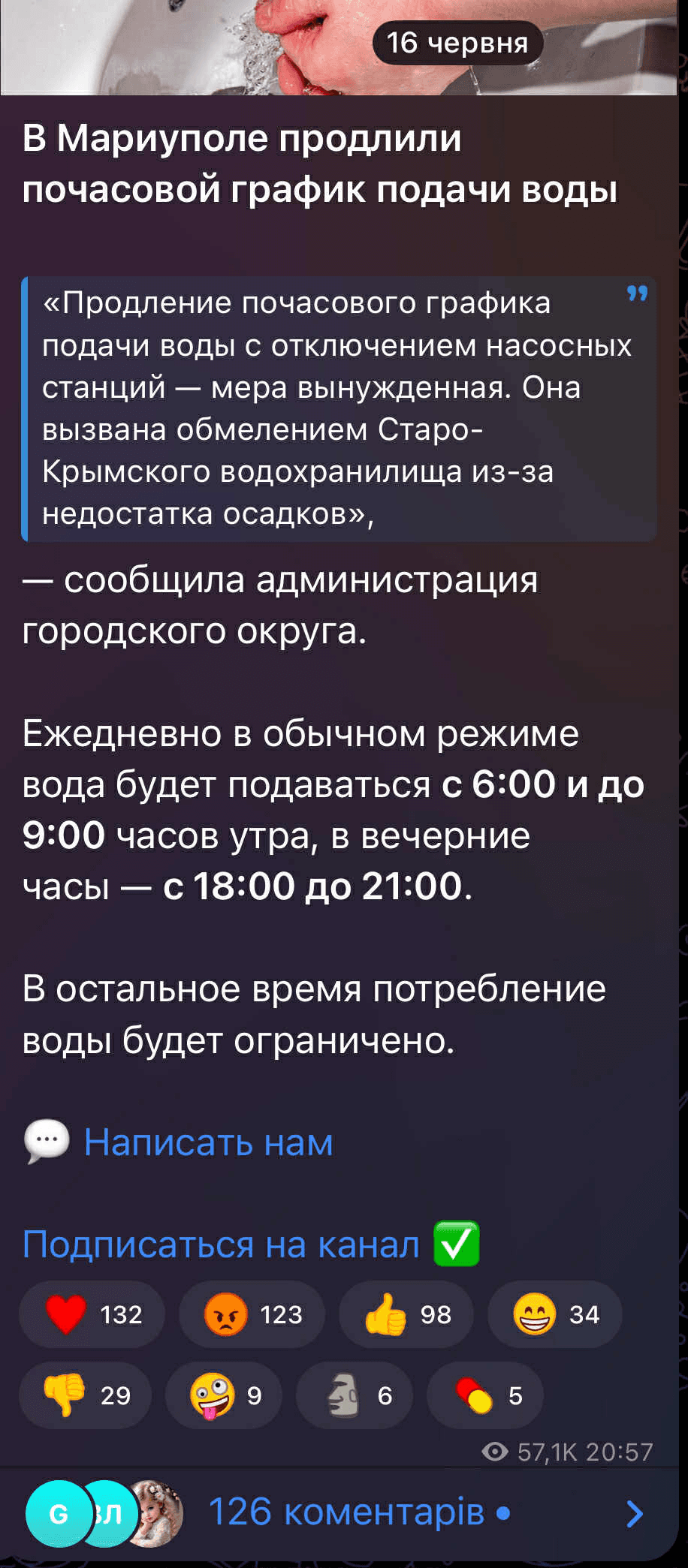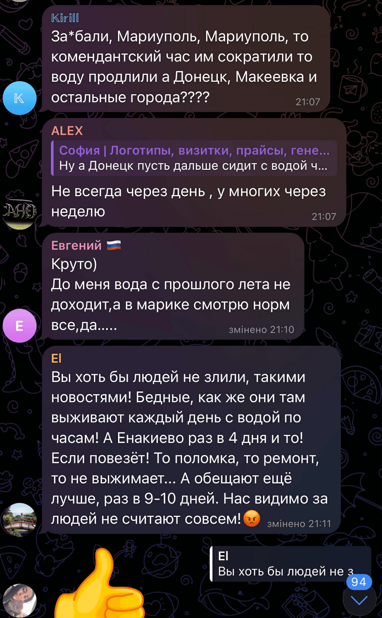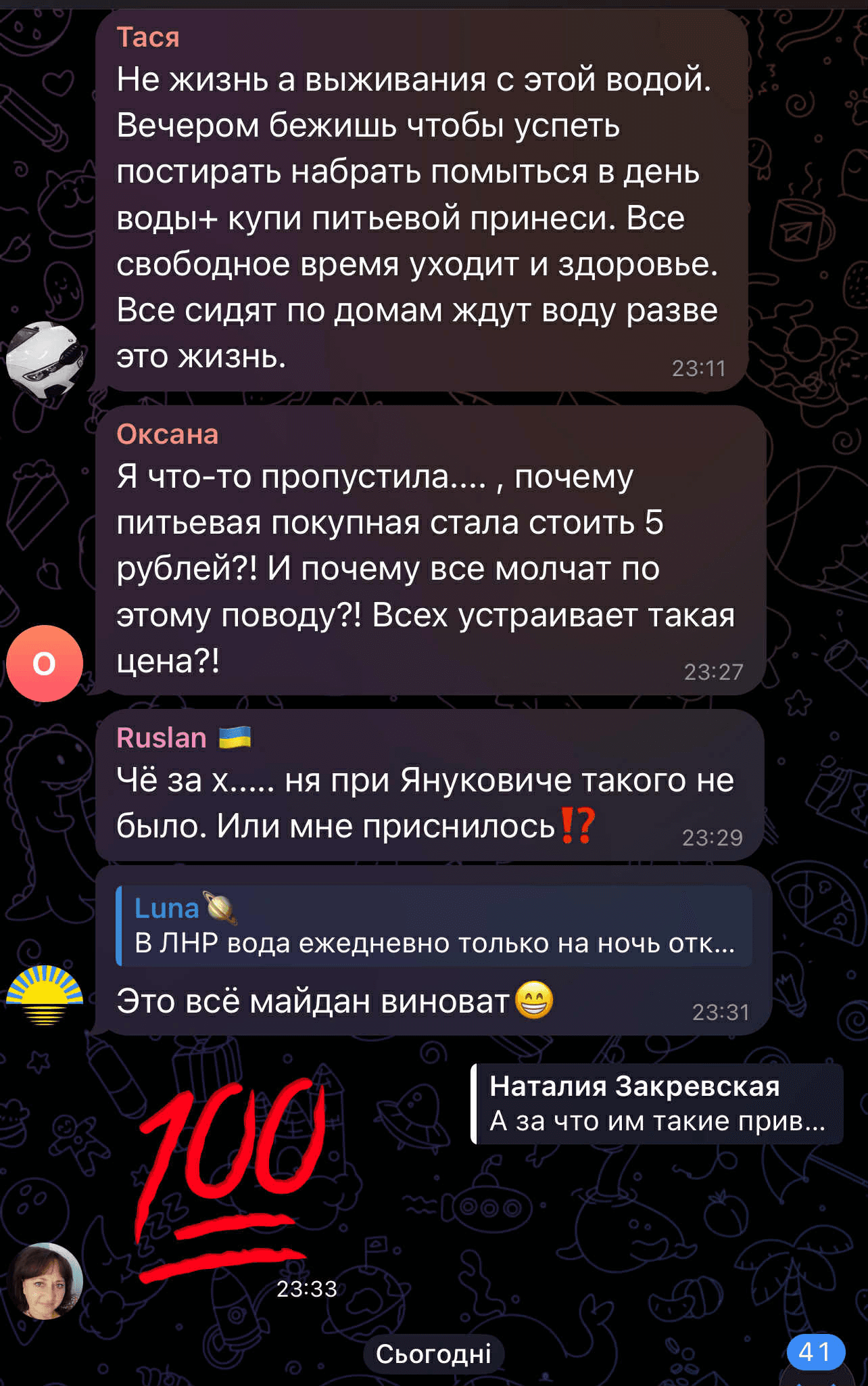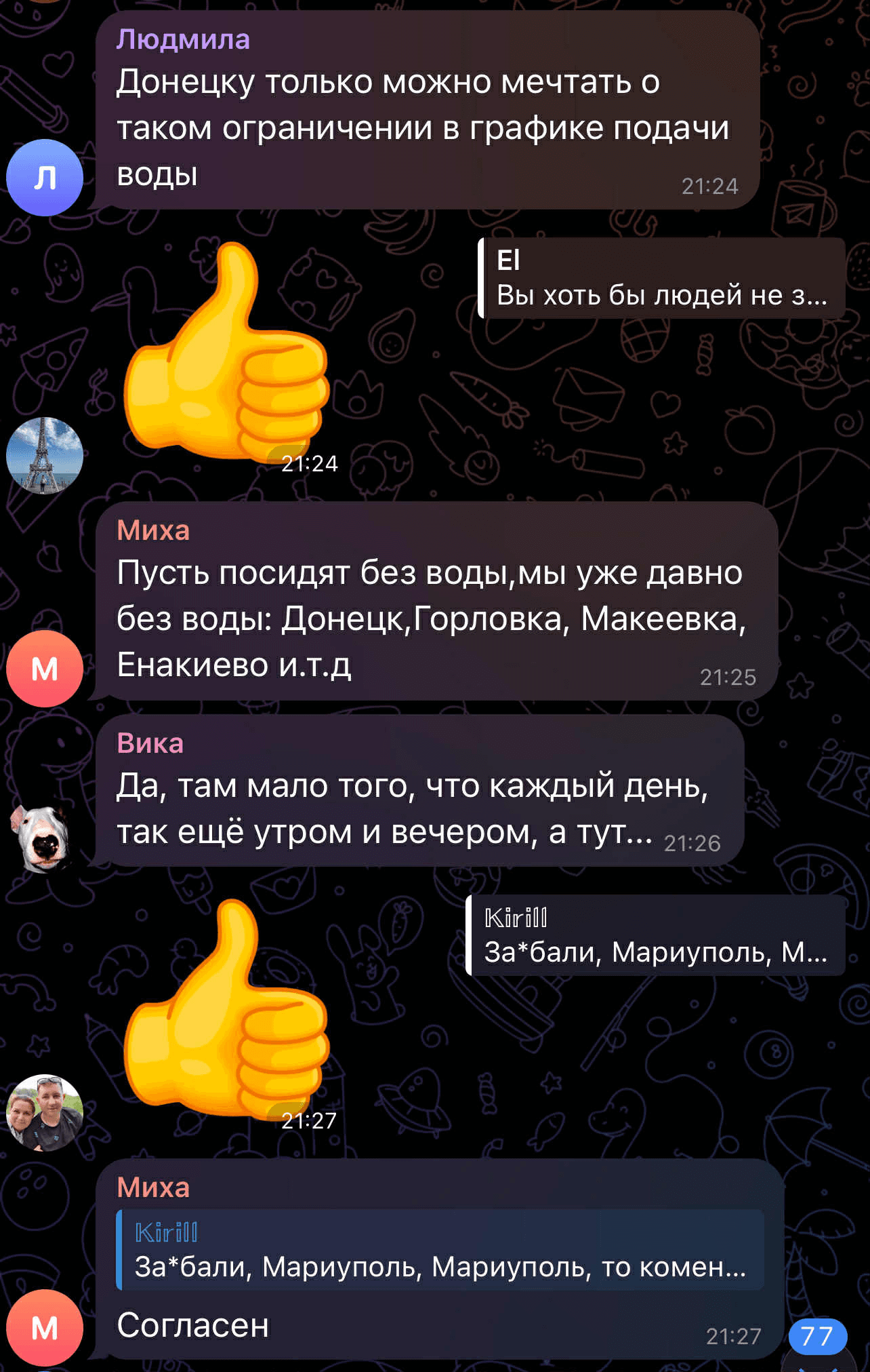 После того, как эту новость опубликовали в одном из Телеграм-ресурсов, пишущем о жизни оккупантов в оккупированном Донецке, в комментариях возникло возмущение и дискуссия, оказалось, что в оккупированном Донецке завидуют такому графику подачи воды с ограничениями, который действует в оккупированном Мариуполе. Люди в оккупации и дальше жалуются, что им приходится пристраиваться жить без стабильного водоснабжения.
