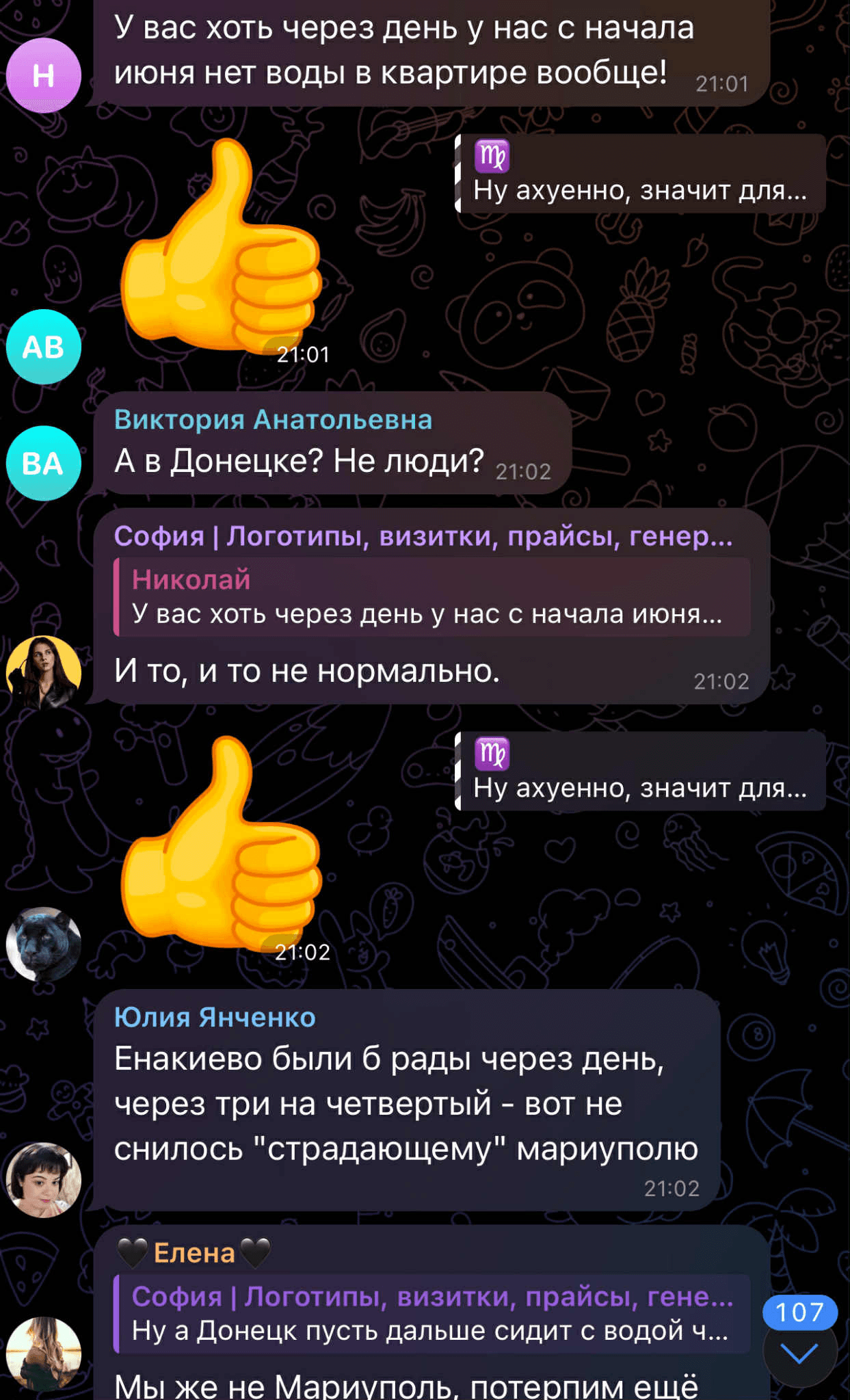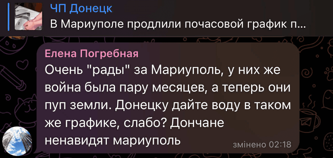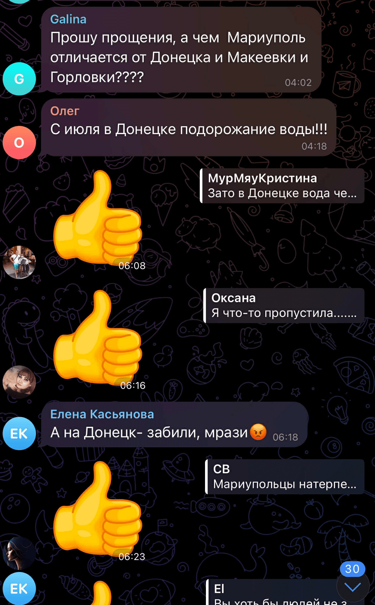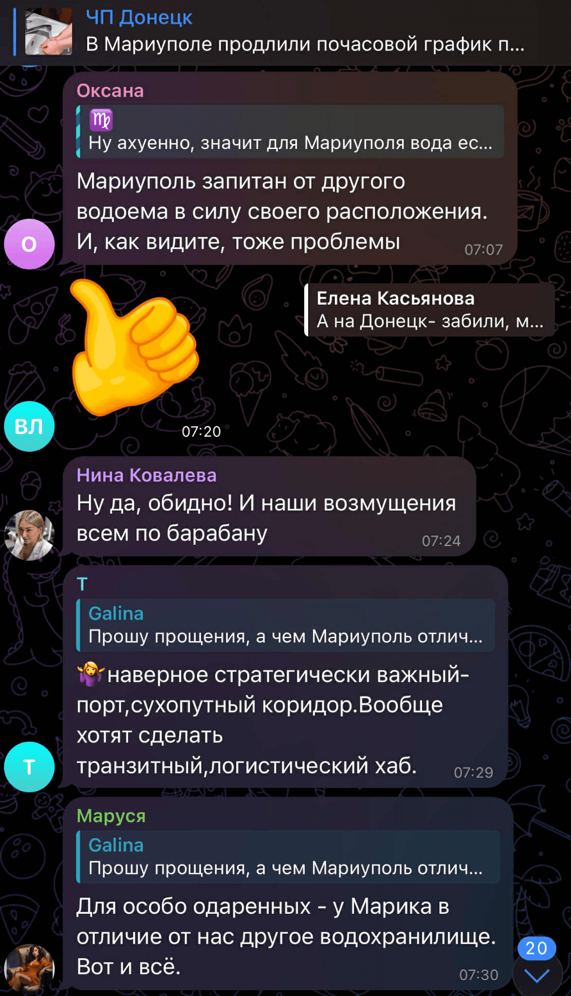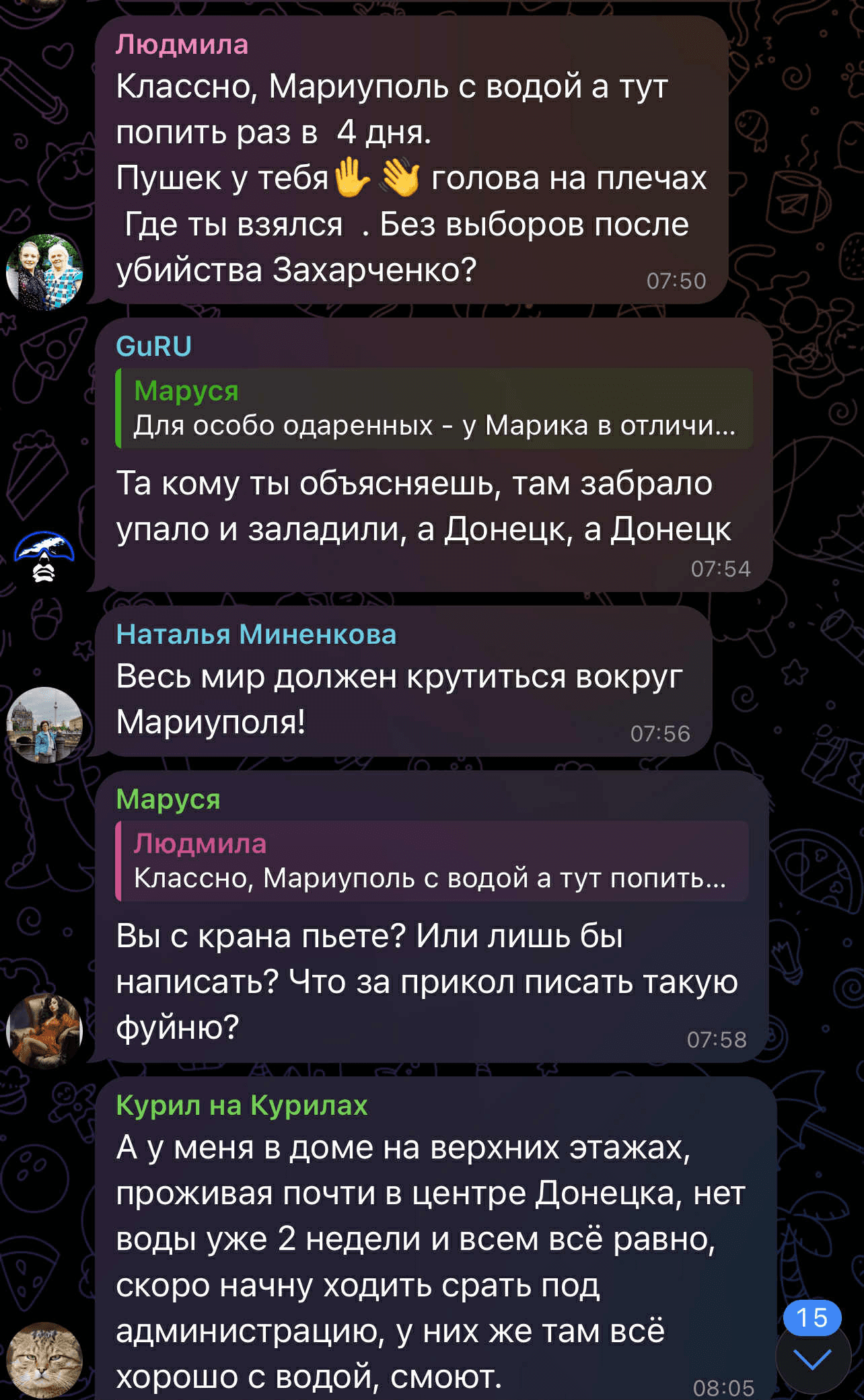 После того, как эту новость опубликовали в одном из Телеграм-ресурсов, пишущем о жизни оккупантов в оккупированном Донецке, в комментариях возникло возмущение и дискуссия, оказалось, что в оккупированном Донецке завидуют такому графику подачи воды с ограничениями, который действует в оккупированном Мариуполе. Люди в оккупации и дальше жалуются, что им приходится пристраиваться жить без стабильного водоснабжения.