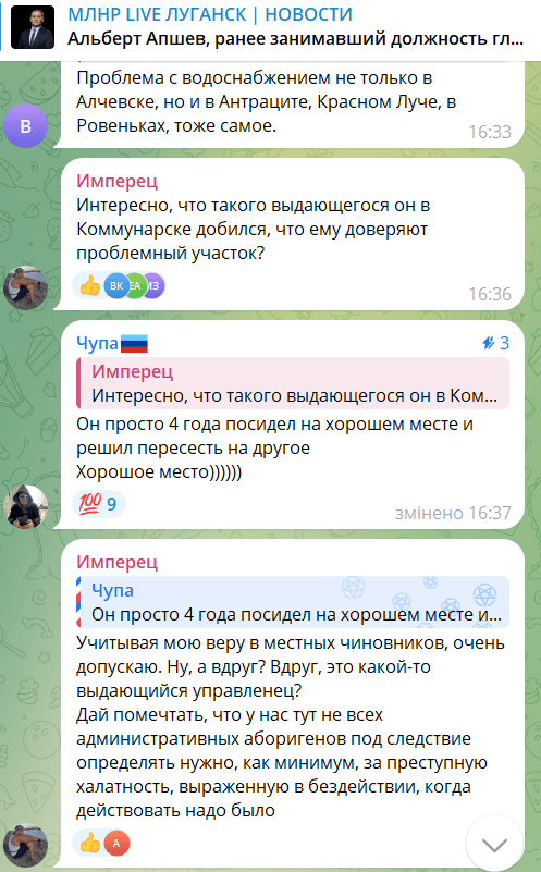 Как стало известно, фейковый «глава» Алчевска от оккупантов Альберт Апшев «сложил полномочия» в связи с «переходом на другую работу», ему уже нашли «работу» в оккупации.