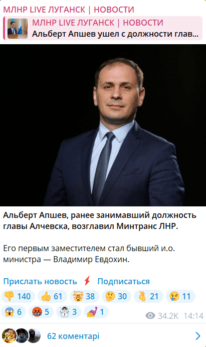 Альберт Апшев, который ранее «сложил полномочия» непризнанного «главы Алчевска», возглавил «минтранс лнр»