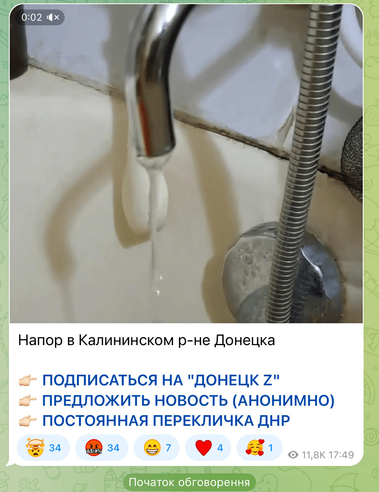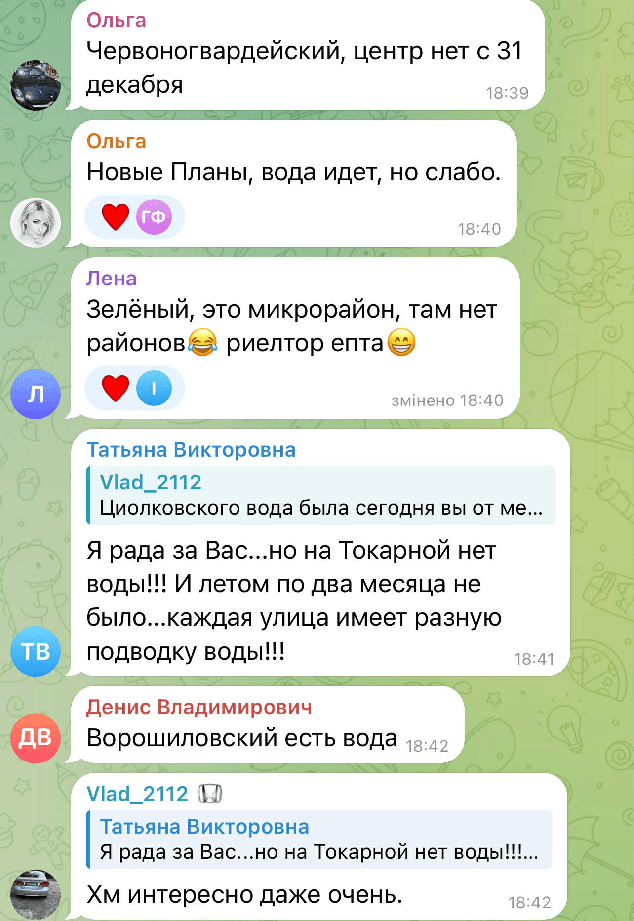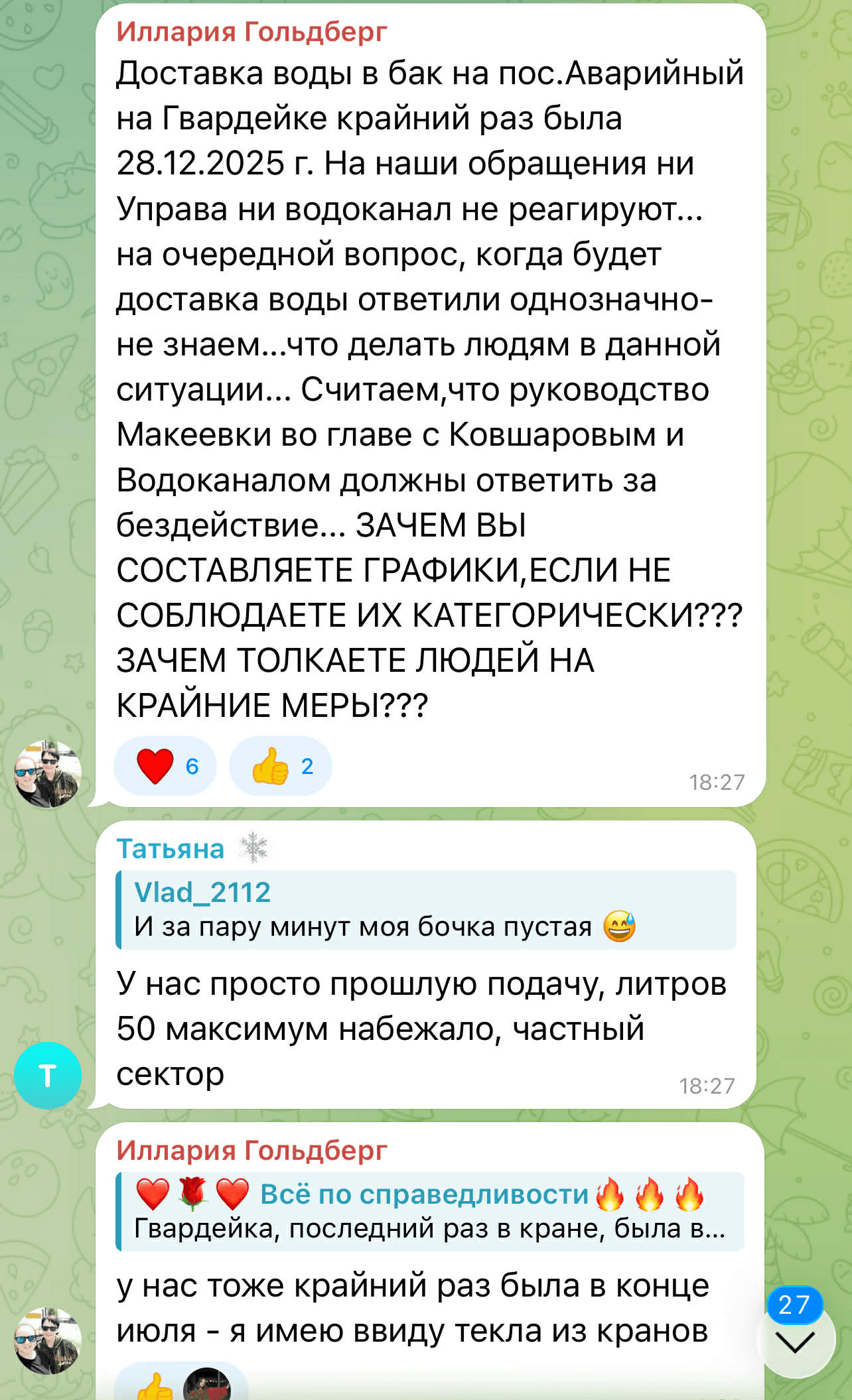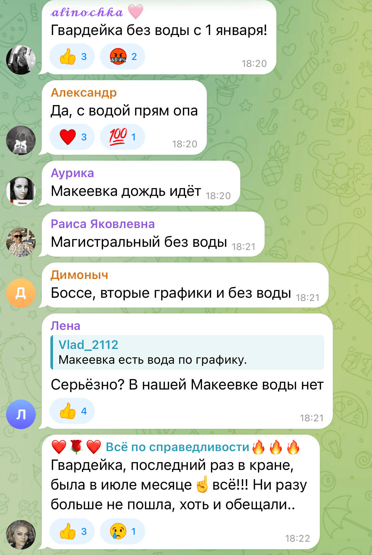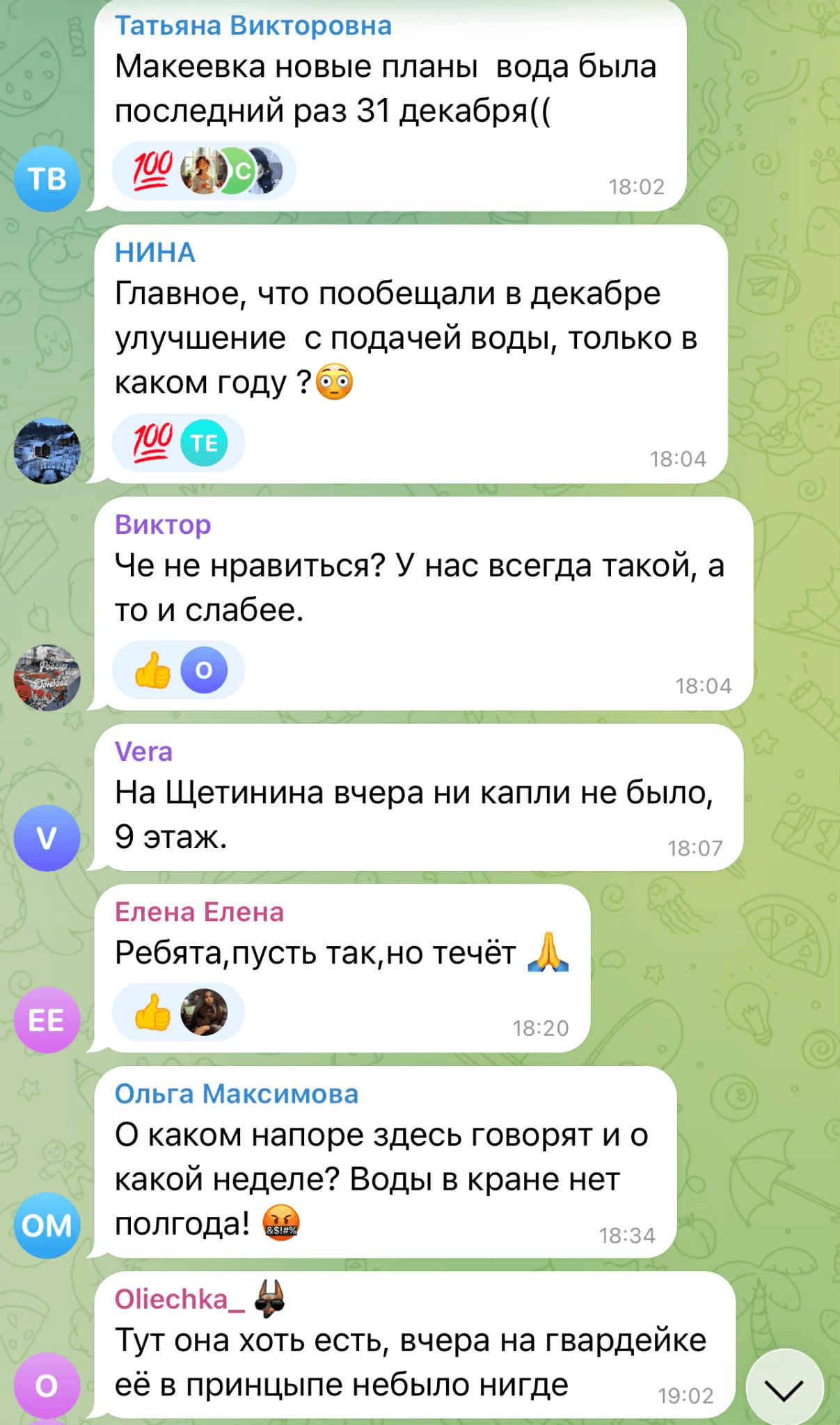 «Макеевка, Донецк, воды почти нигде нет, где она должна быть по графику. Ситуация с каждым днем ухудшается, власти ничего не комментируют, диспетчеры водоканала отвечают, что подача максимально сокращена, воду они сами не получают, чтобы качать ее дальше людям. Напомним, в декабре, а позже в январе нам обещали существенное улучшение подачи воды. Такого «улучшения» мы реально не ждали!» — говорится в посте ресурса, который пишет о жизни оккупантов в Телеграм.