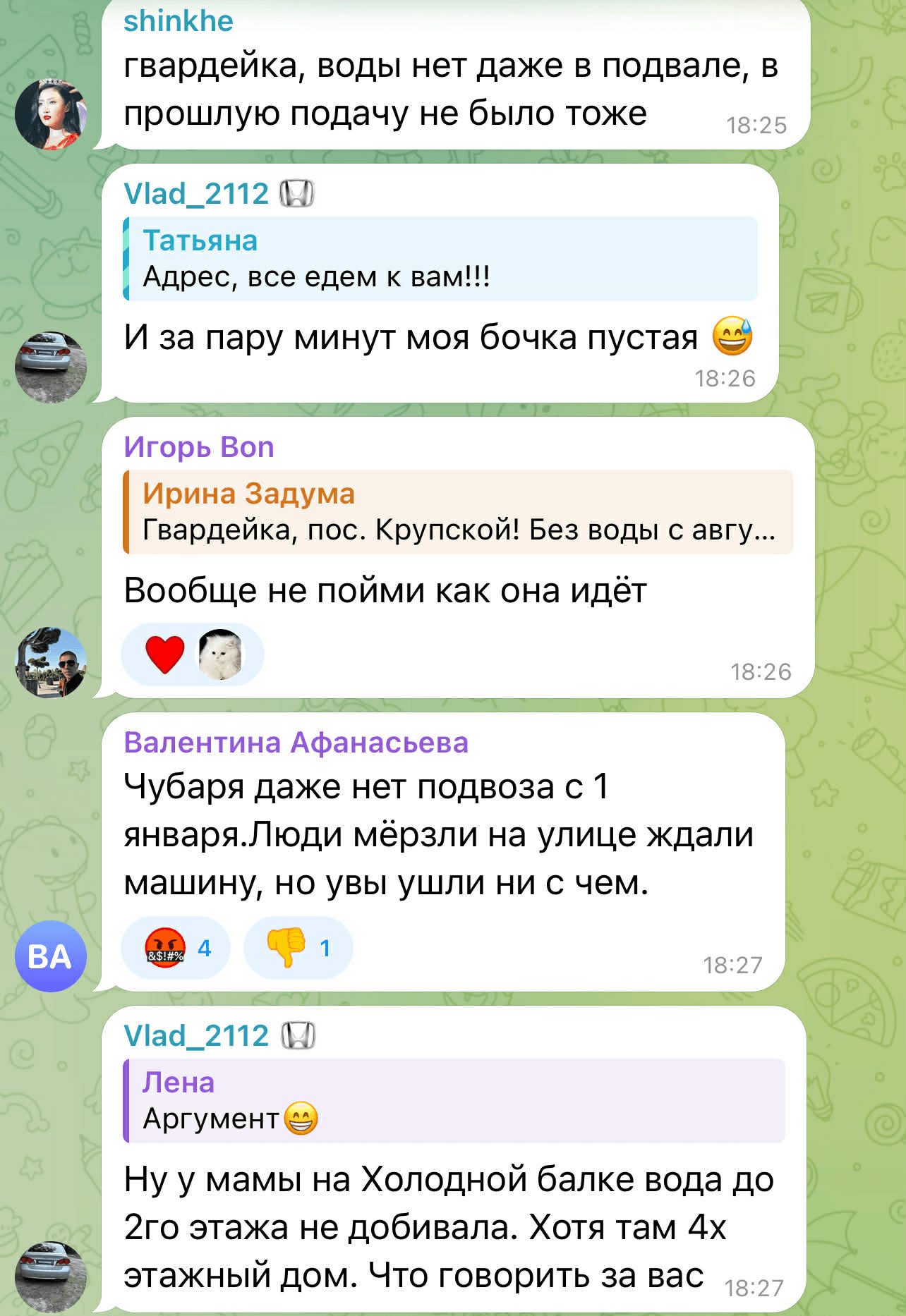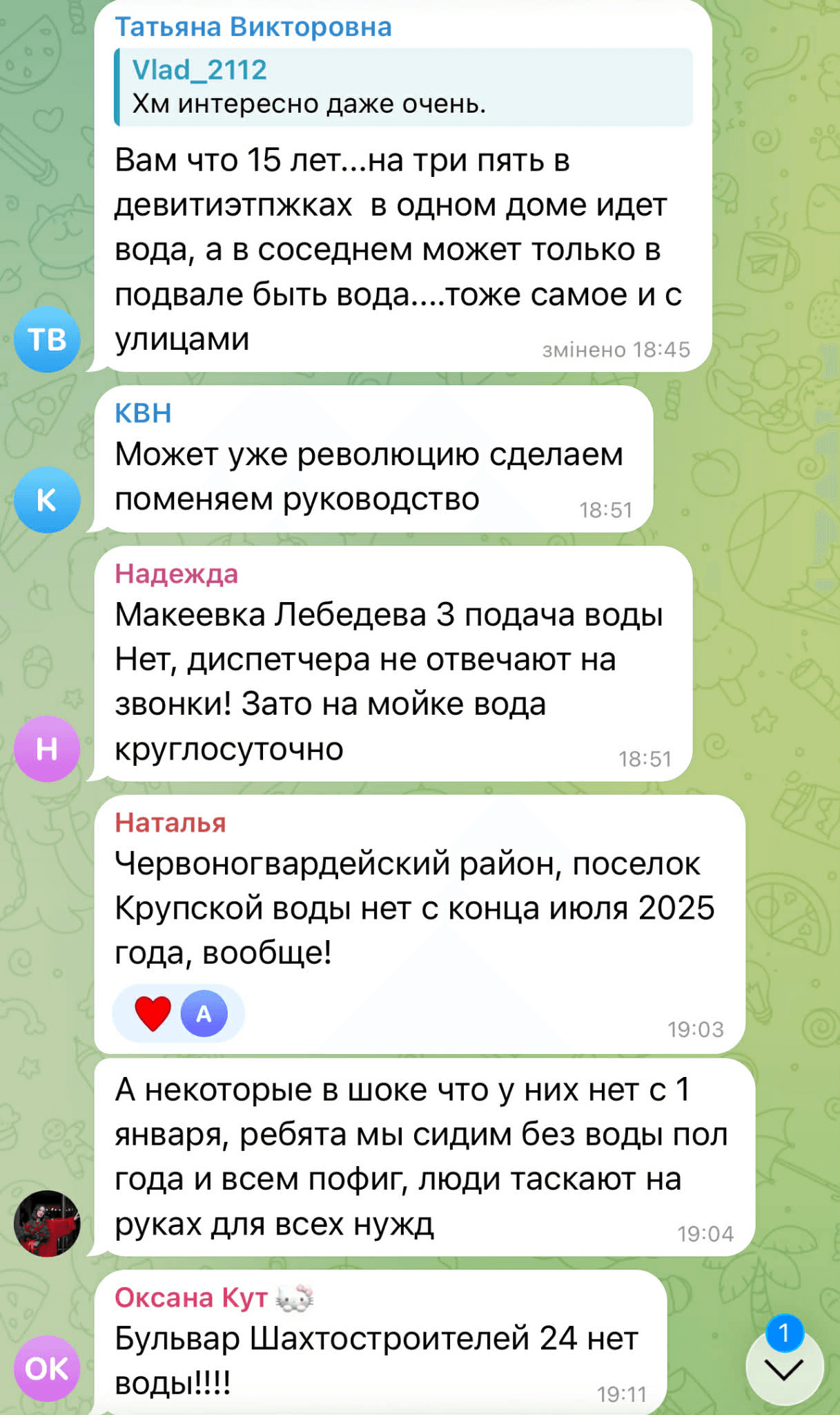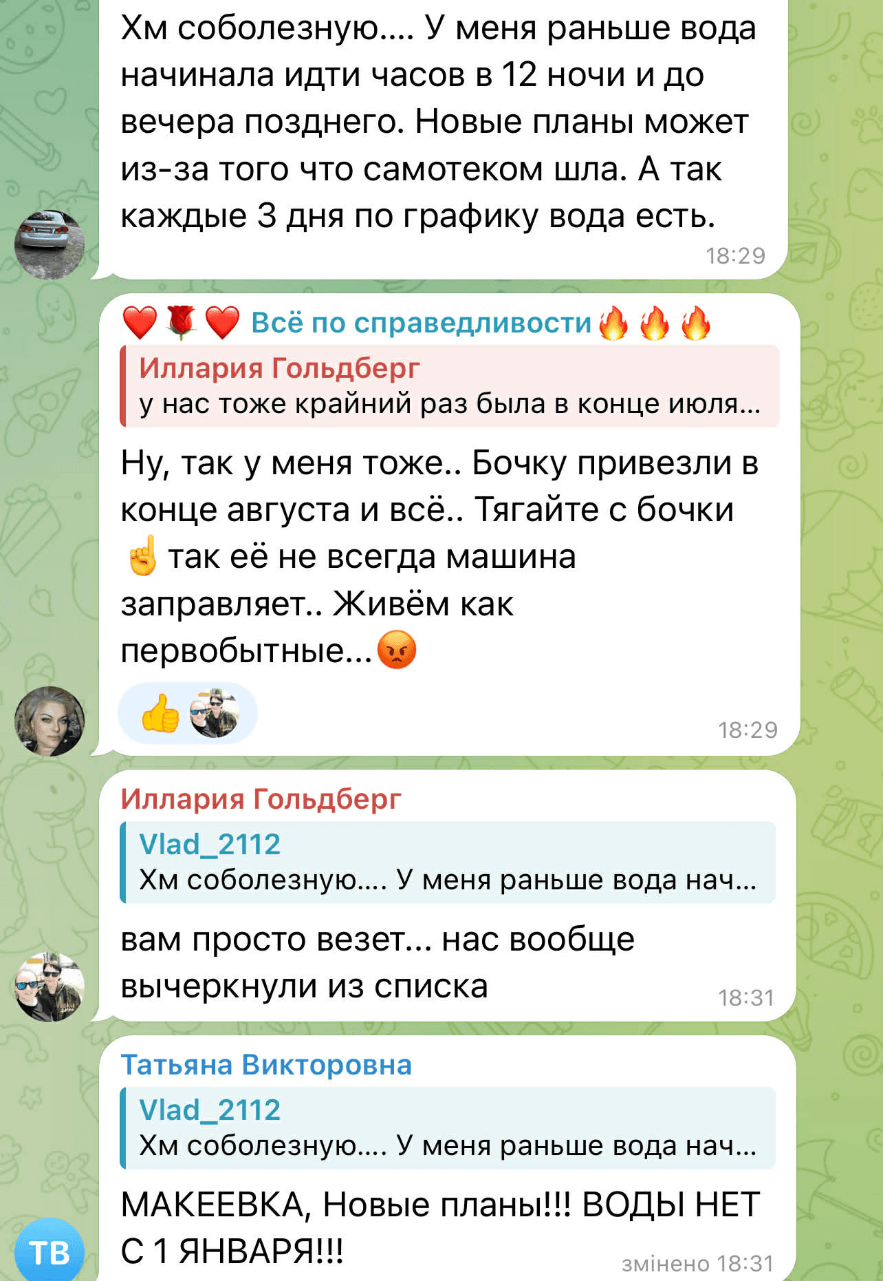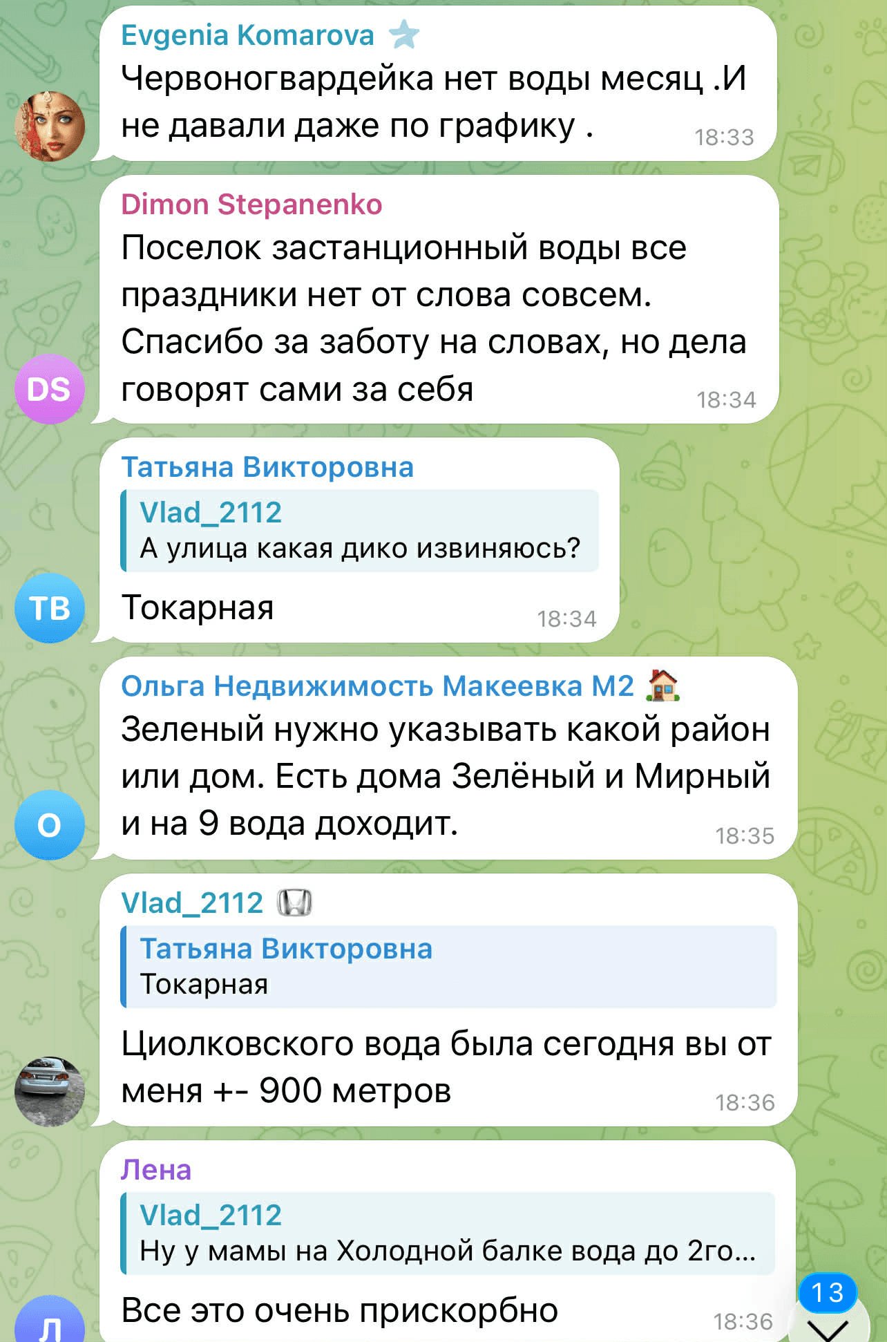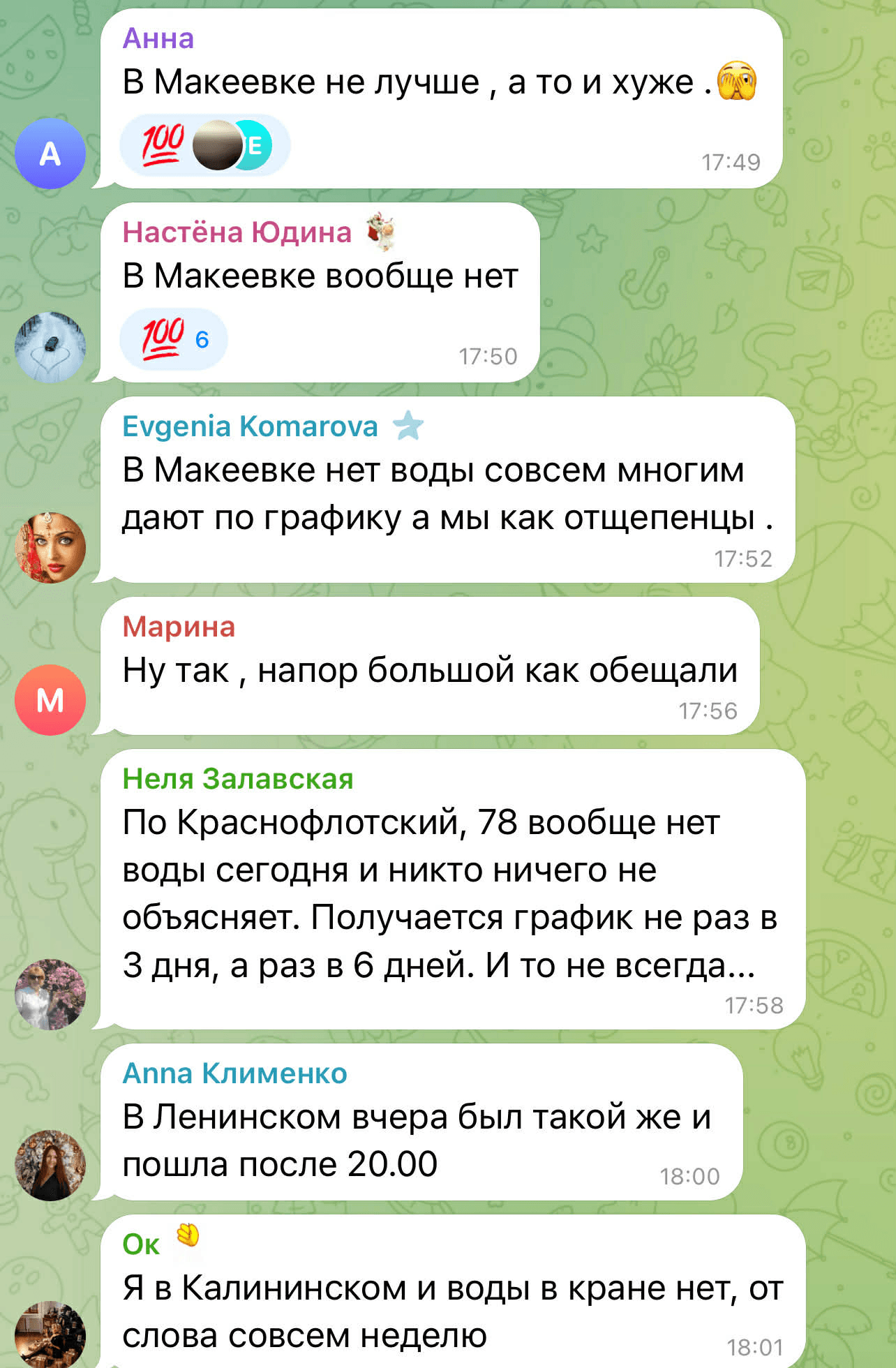 Далее, под этим постом в Телеграм, пользователи провели «перекличку по воде» на ТОТ Донецкой области, оказалось, что многие локации очень долгое время остаются без воды и проблемы людей оккупационная «власть» решать не спешит.