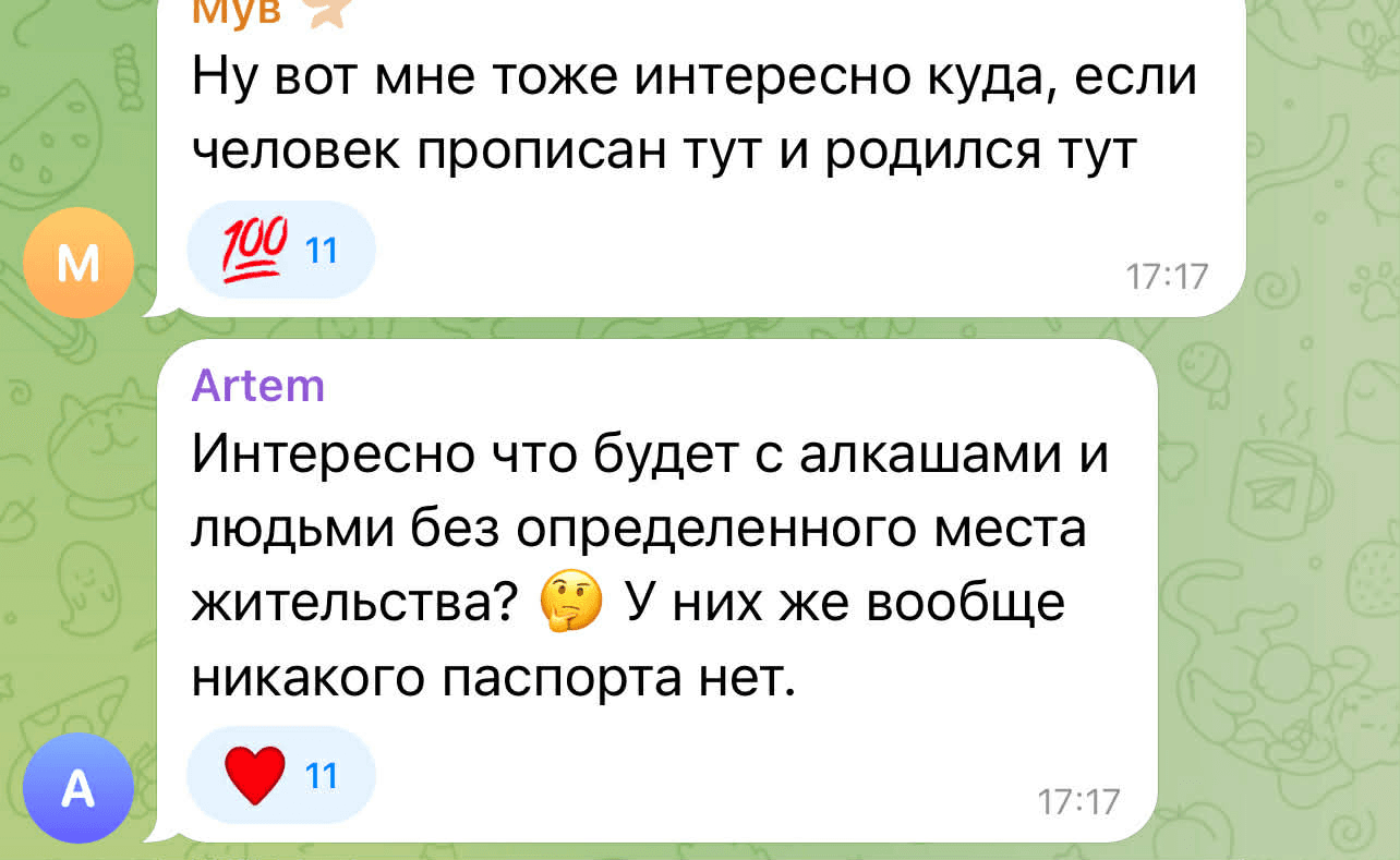 В комментариях к этой новости в Телеграмме отмечают, что далеко не все могут и хотят проходить «оформление», и далеко не у всех есть средства для этого.
