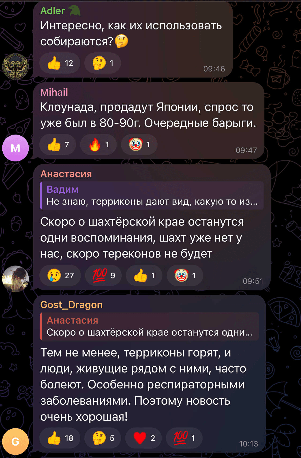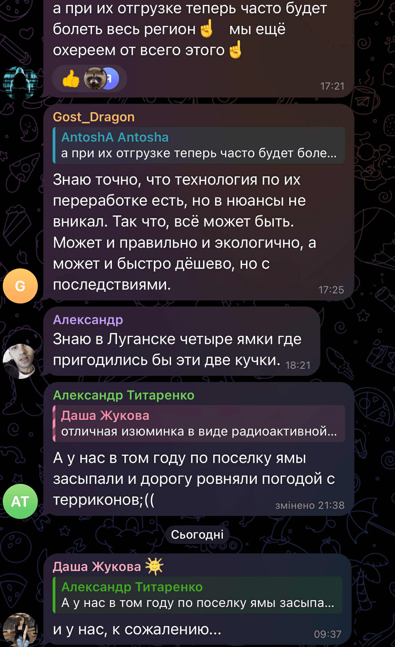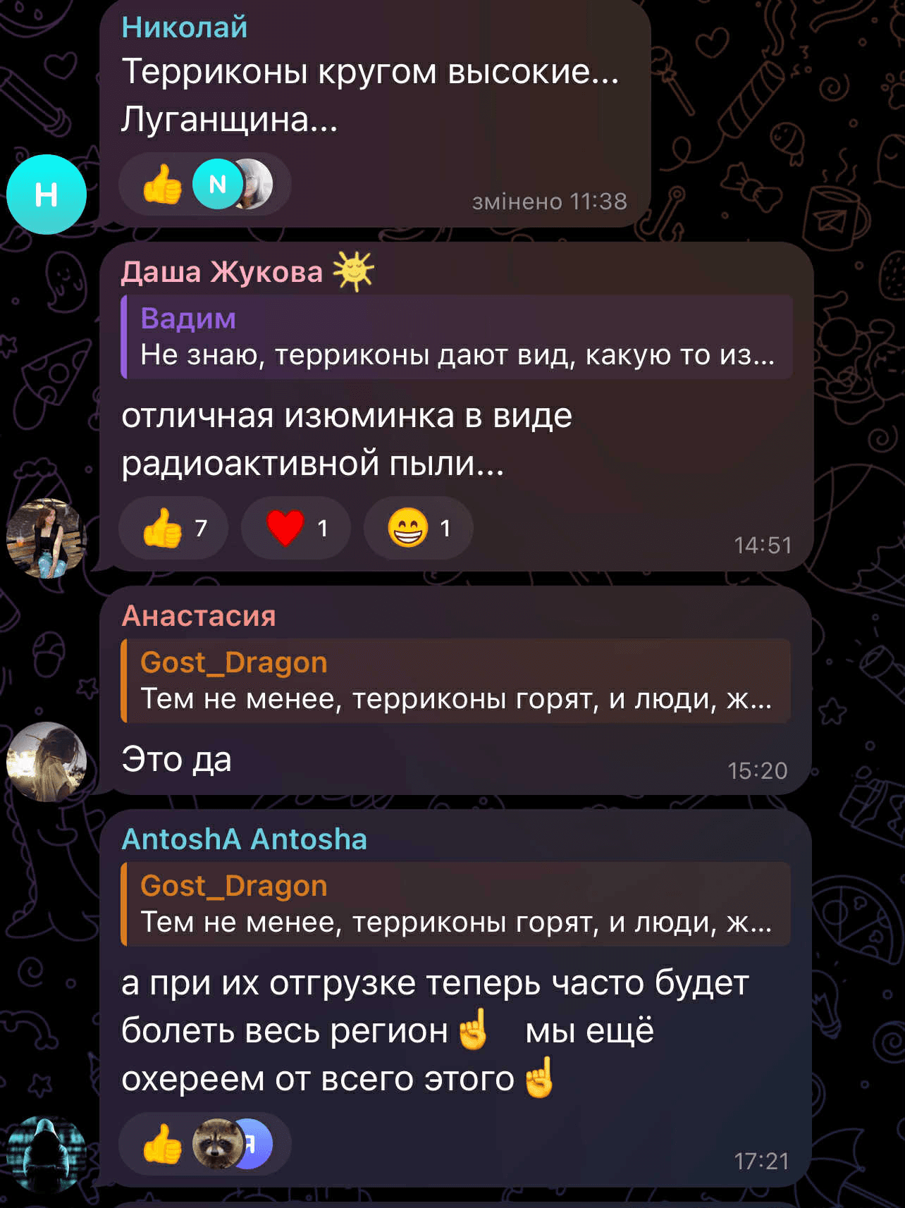 В комментариях к новости возмущаются, что оккупанты уничтожают визитные карточки украинского Донбасса и переживают, как такие действия повлияют на экологию и не будет ли угрозы воздуху, окружающей среде и людям, из-за таких «переработок».