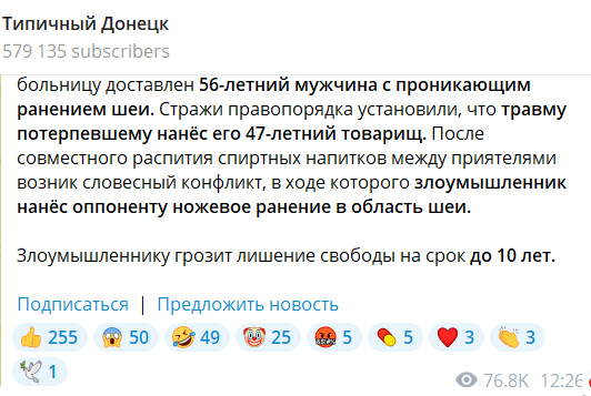 В Макеевку поступило сообщение о том, что в больницу доставлен 56-летний мужчина с проникающим ранением шеи.