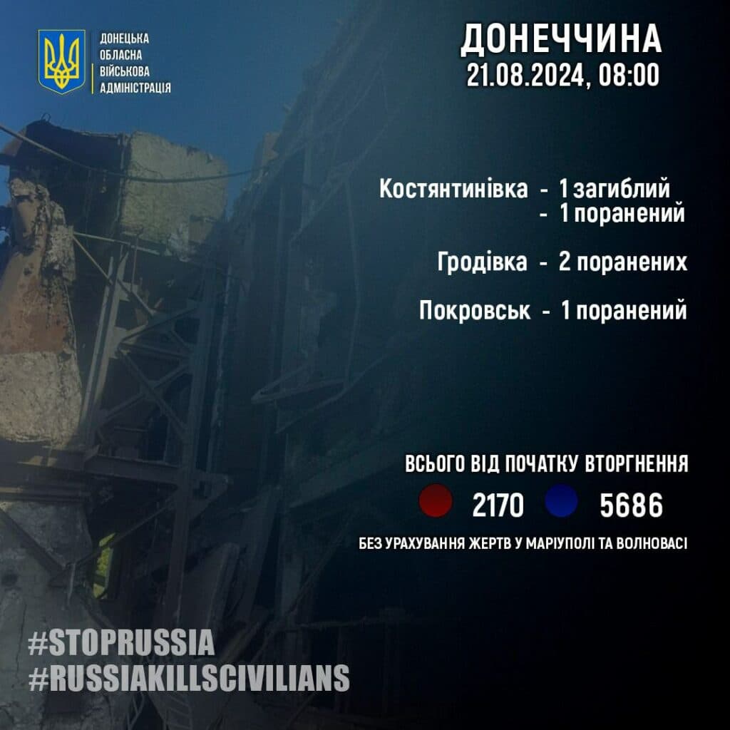 "За 20 августа россияне убили 1 жителя Донетчины — в Константиновке. Еще 4 человека в области за сутки получили ранения. Общее число жертв россиян в Донецкой области подано без учета Мариуполя и Волновахи", — говорится в сообщении.