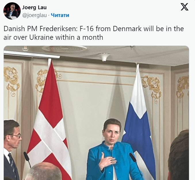 «F-16 из Дании будут в воздухе над Украиной в течение месяца», — сказала Фредериксен.