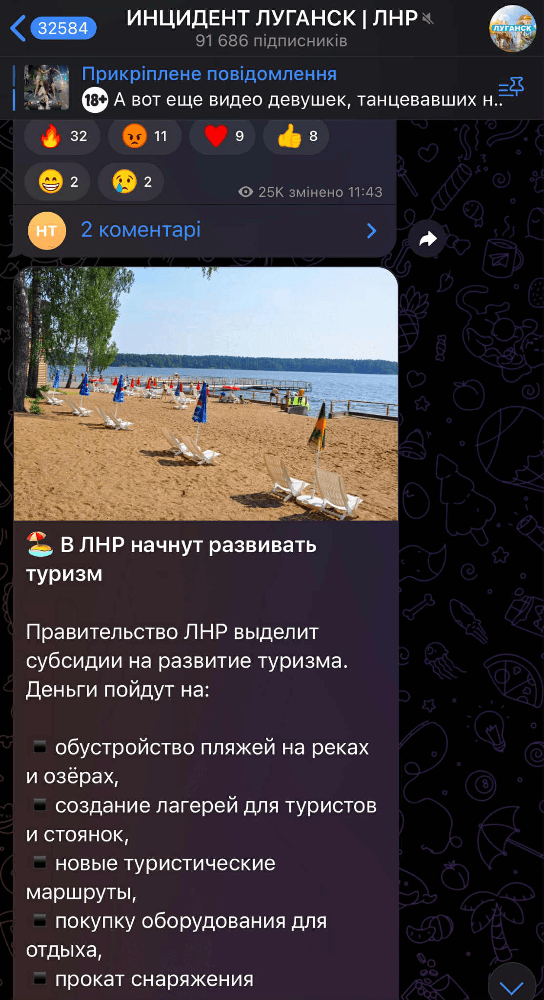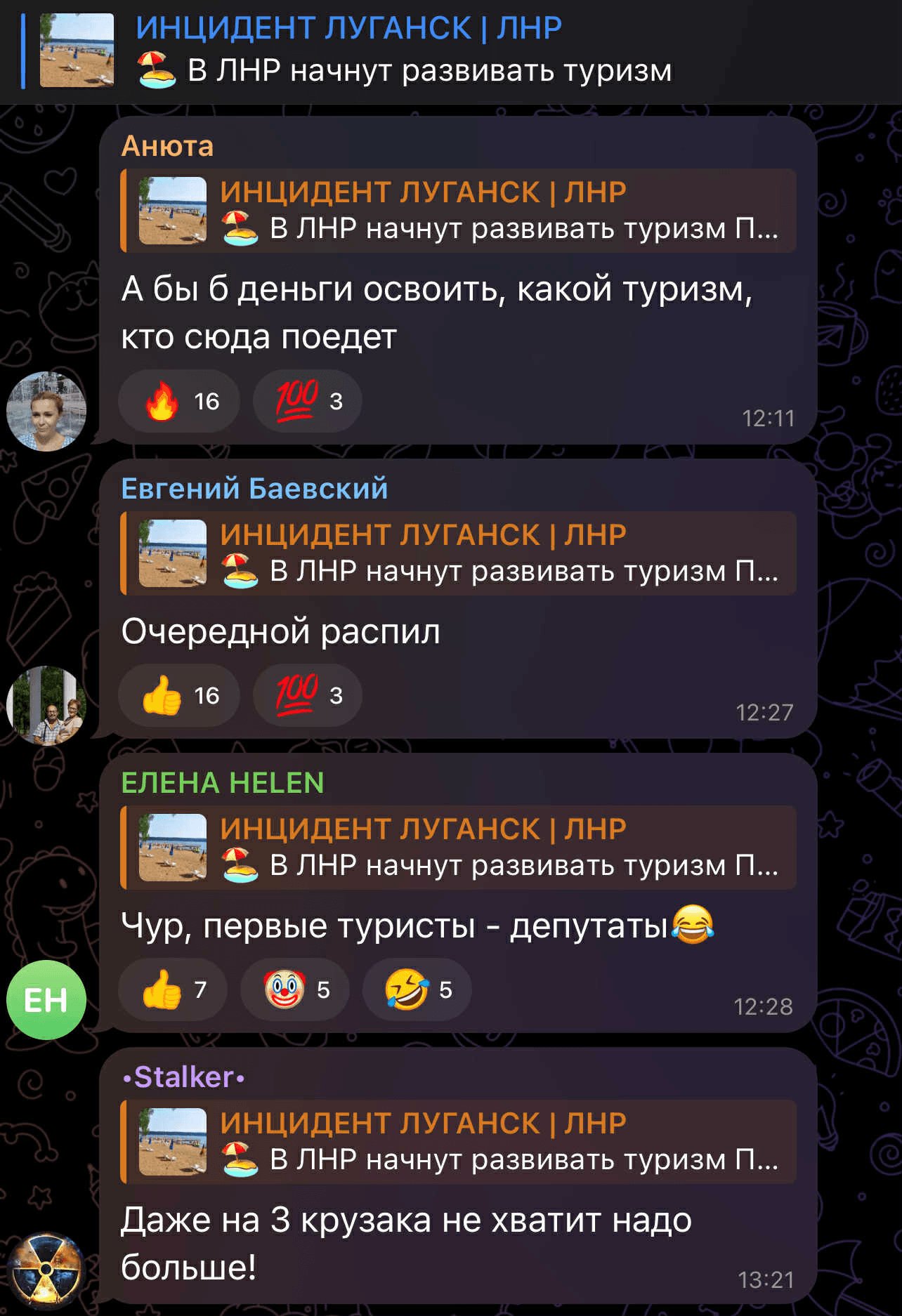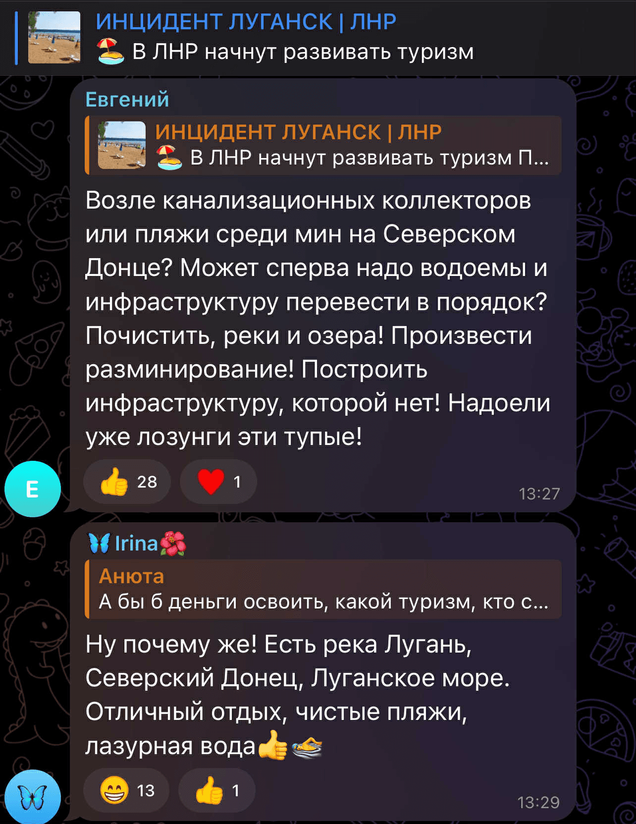 В частности обещания захватчиков с «миллионными вложениями» касаются условных «улучшений пляжей на реках и озерах, создания лагеров, туристических маршрутов и туристического снаряжения».