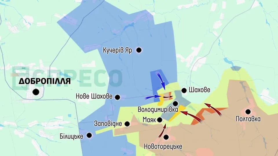 Поки ЗСУ підтискають із заходу — окупанти прориваються на схід, до Шахового. З іншого боку, ворог наступає і має просування в напрямку Володимирівки, "сіра" зона знову розширилась на вулиці села.