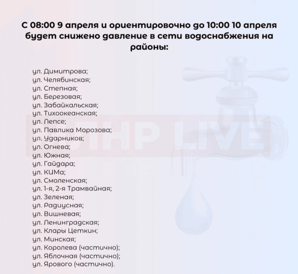 Також за деякими адресами буде знижено тиск у мережі водопостачання, повідомили окупанти.