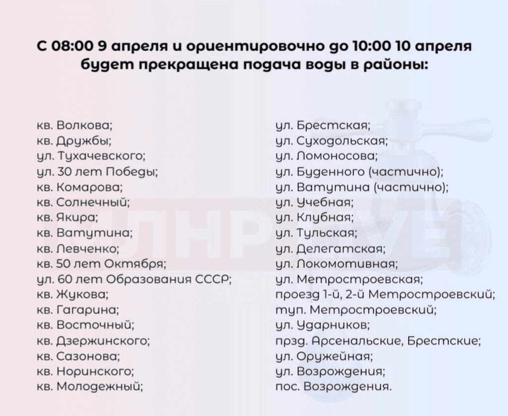 Повідомляється, що Подача води буде припинена з 08:00 9 квітня та орієнтовно до 10:00 10 квітня.