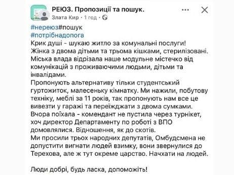 "І ось напередодні зими людям кажуть: вимітайтеся. Хто хоче переїжджайте в гуртожиток, але без тварин і майна, бо там їм місця нема", — наголошує жінка.