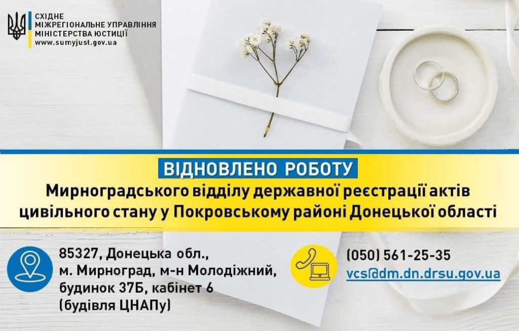 Орган реєстрації актів цивільного стану працює в Мирнограді, м-н Молодіжний, 37Б (будівля міського ЦНАПу), кабінет 6 на другому поверсі.